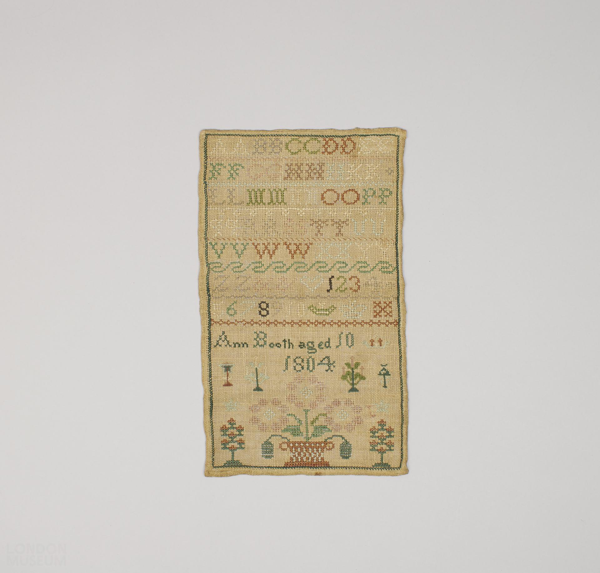 Light brown coloured hessian worked in polychrome silks in cross and tent stitch. Rows of pattern worked alternately with the alphabet and numerals, stylised shrubs and flowers with a green border. Inscription: "Ann Booth aged 10 1804". Condition: good, has been conserved.