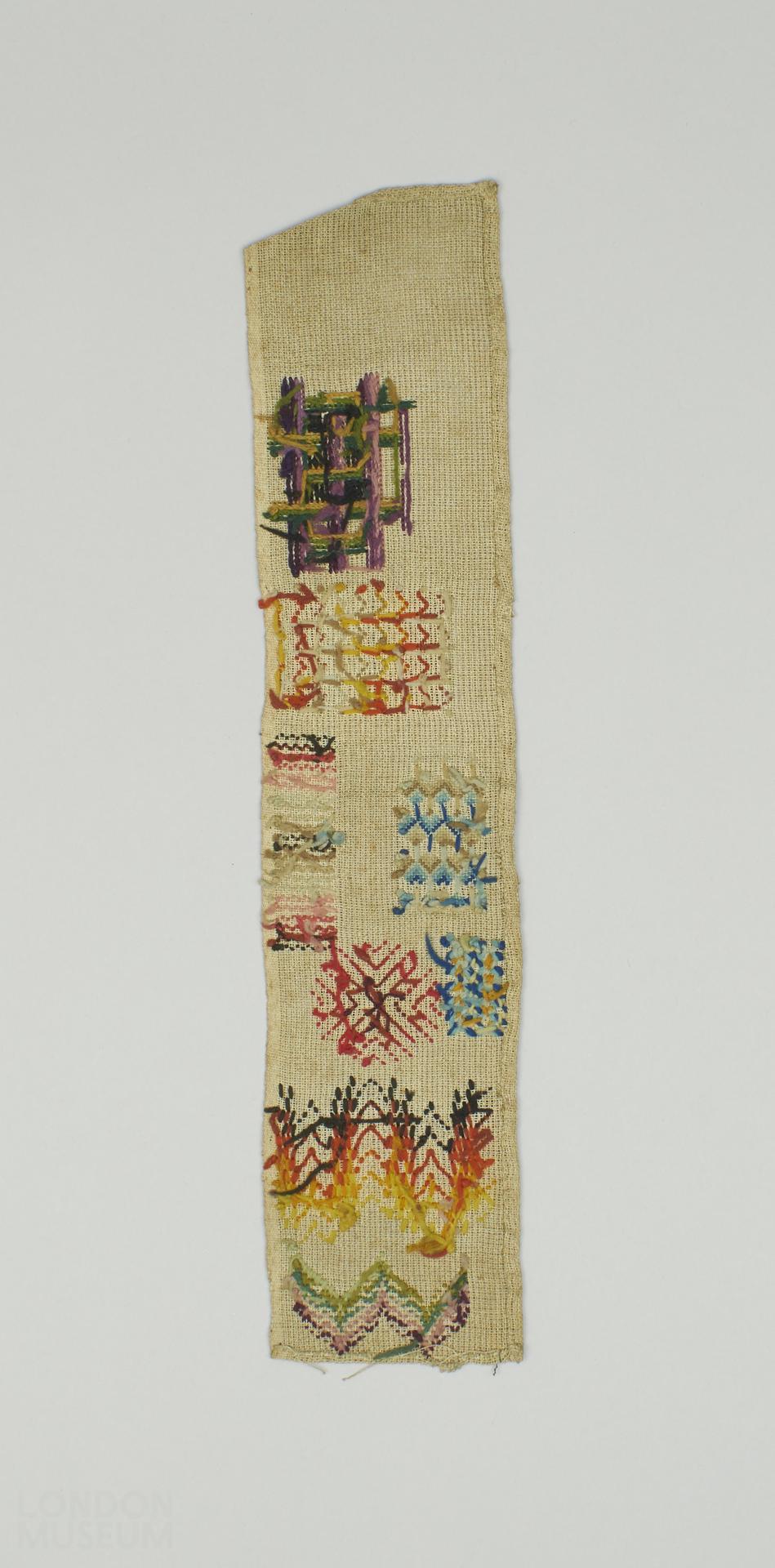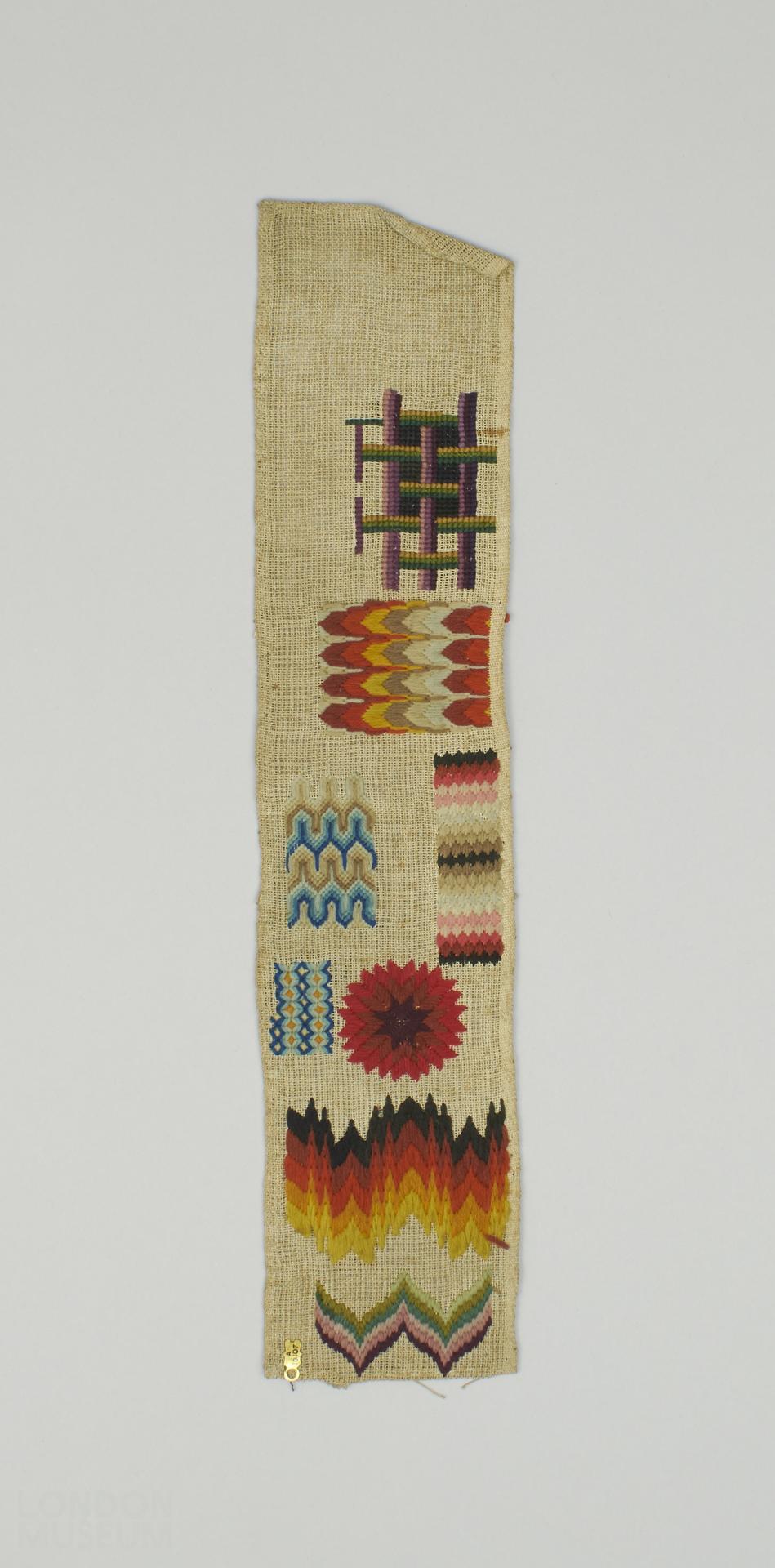 Off white canvas worked in polychrome wools in cross, satin, Florentine, Holbein, gobelin and laid stitch; with eight different geometric designs. Three sides hemmed, one side selvedge. Condition: slight discolouring. One of six (A10103-A10108) pieces of woolwork designs, early 19th century.