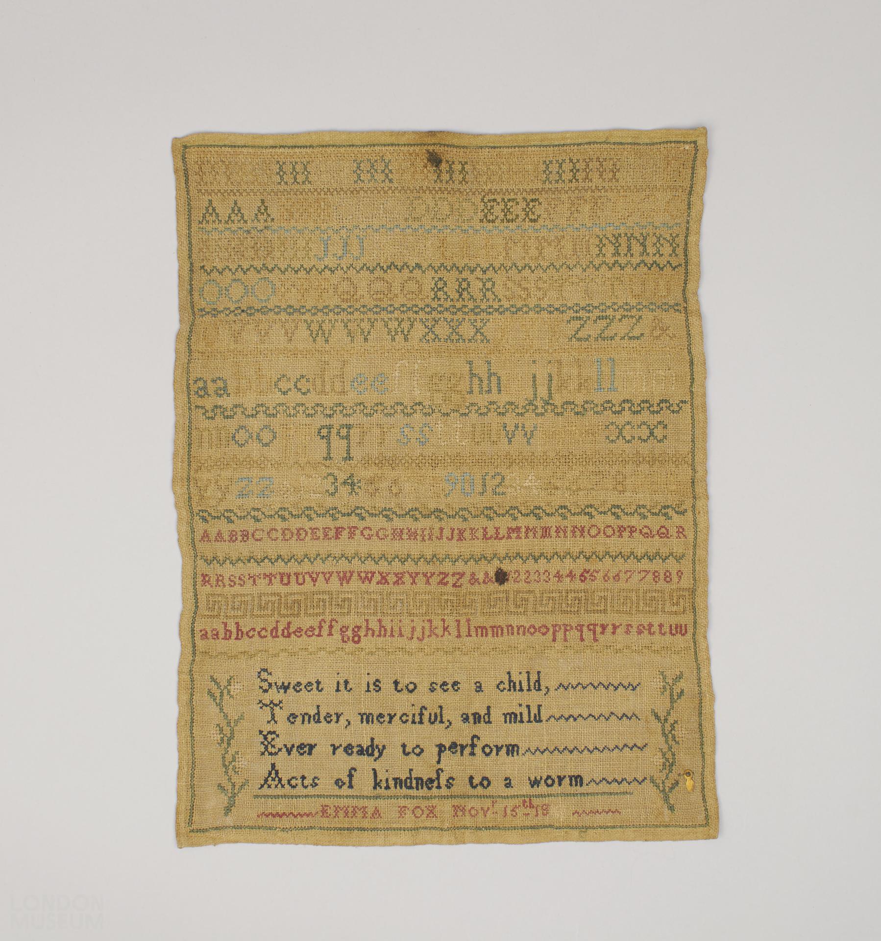 Brown hessian sampler, worked in cross stitch in coloured silks (red, light and dark blue and brown) with simple cross stitch border, rows of conventional patterns worked alternately with the alphabet and numerals, A moralising verse is worked in black thread 'SWEET IT IS TO SEE A CHILD / TENDER, MERCIFUL AND MILD/ EVER READY TO PERFORM/ ACTS OF KINDNESS TO A WORM'. Along the bottom edge is embroidered 'Emma Fox Novr 15th - 18'. Two sides hemmed, two sides selvedge. The last two numerals of the date have been unstitched. Condition: two dark stains.
