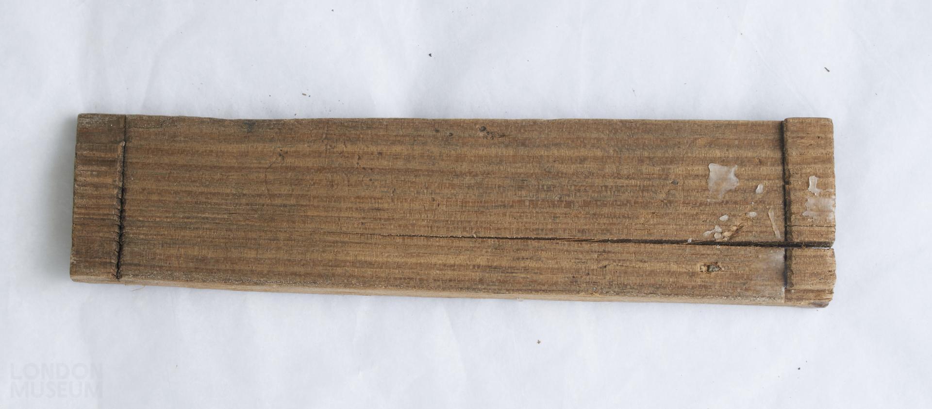 Fragment of wooden writing tablet with traces of cursive lettering. Fragment from middle of an outside leaf. One side recessed for wax, with remnants of wax at one end.