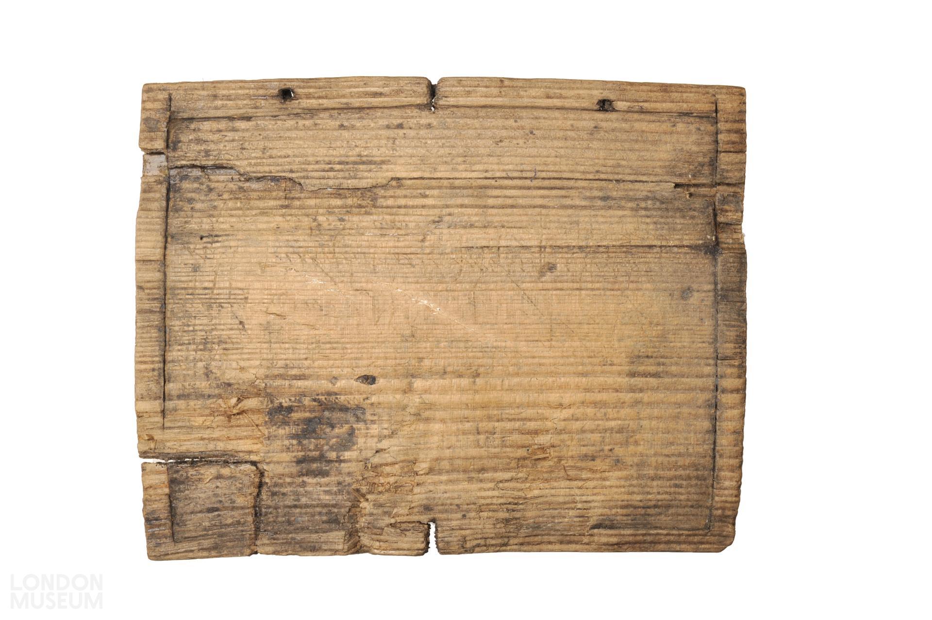 Wooden writing tablet, complete outside leaf. One side recessed for wax; two hinge holes along inner edge and central groove cut into each long edge where writing tablets tied together. Repaired in one corner. Red staining on one side.
