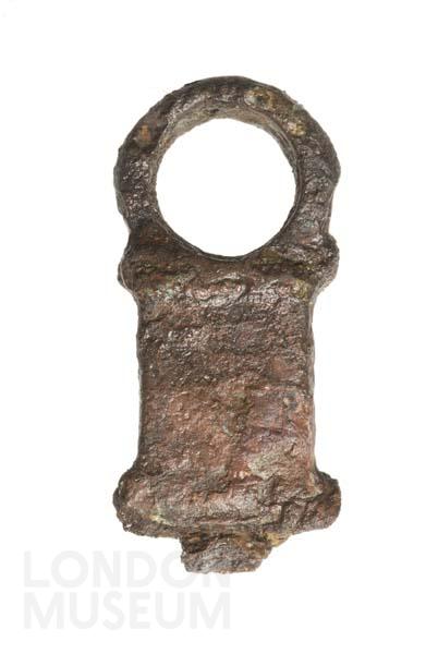 A copper alloy handle with shaft (broken) and raised mouldings; suspension loop.