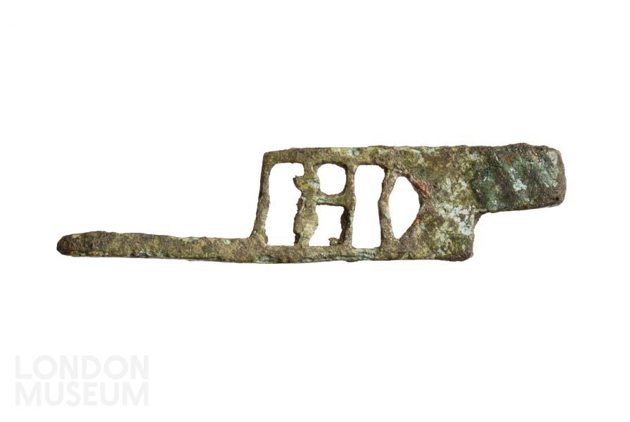 A copper alloy tumbler lock bolt. Flattened rectangular shaft; lock plate with five eyes: semi-circular, two rectangular, two square; flattened L-shaped bolt.