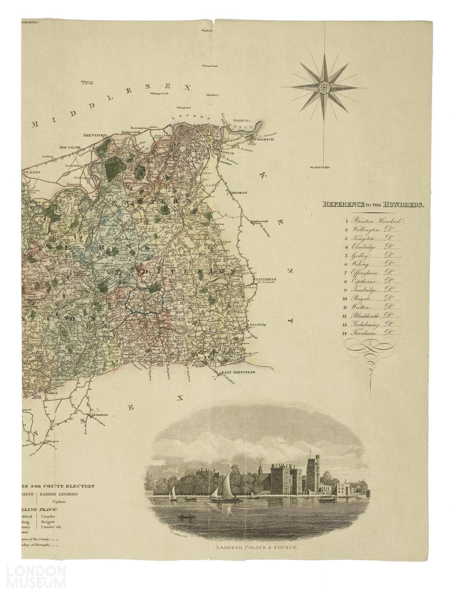 Map of the County of Surrey. Includes image of 'Lambeth Palace & Church' at bottom right-hand corner. From: Pleasure Gardens of South London I. Bound volumes containing an extra-illustrated history of the pleasure gardens of South London, in typescript (61.61/5), page: 5