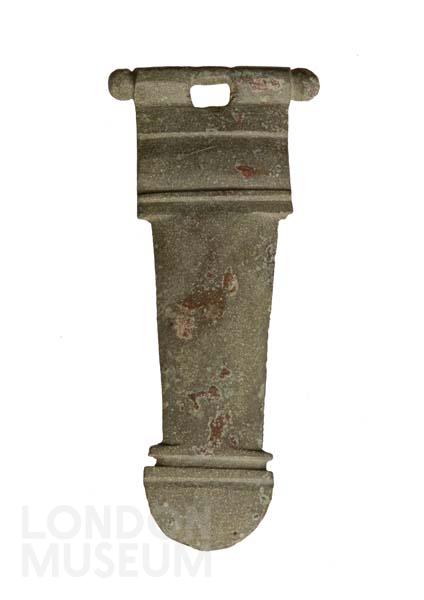 A copper alloy lock hasp. Flattened rectangular hasp with rounded end, widening to flattened square with lateral raised mouldings; rectangular clasp at base.