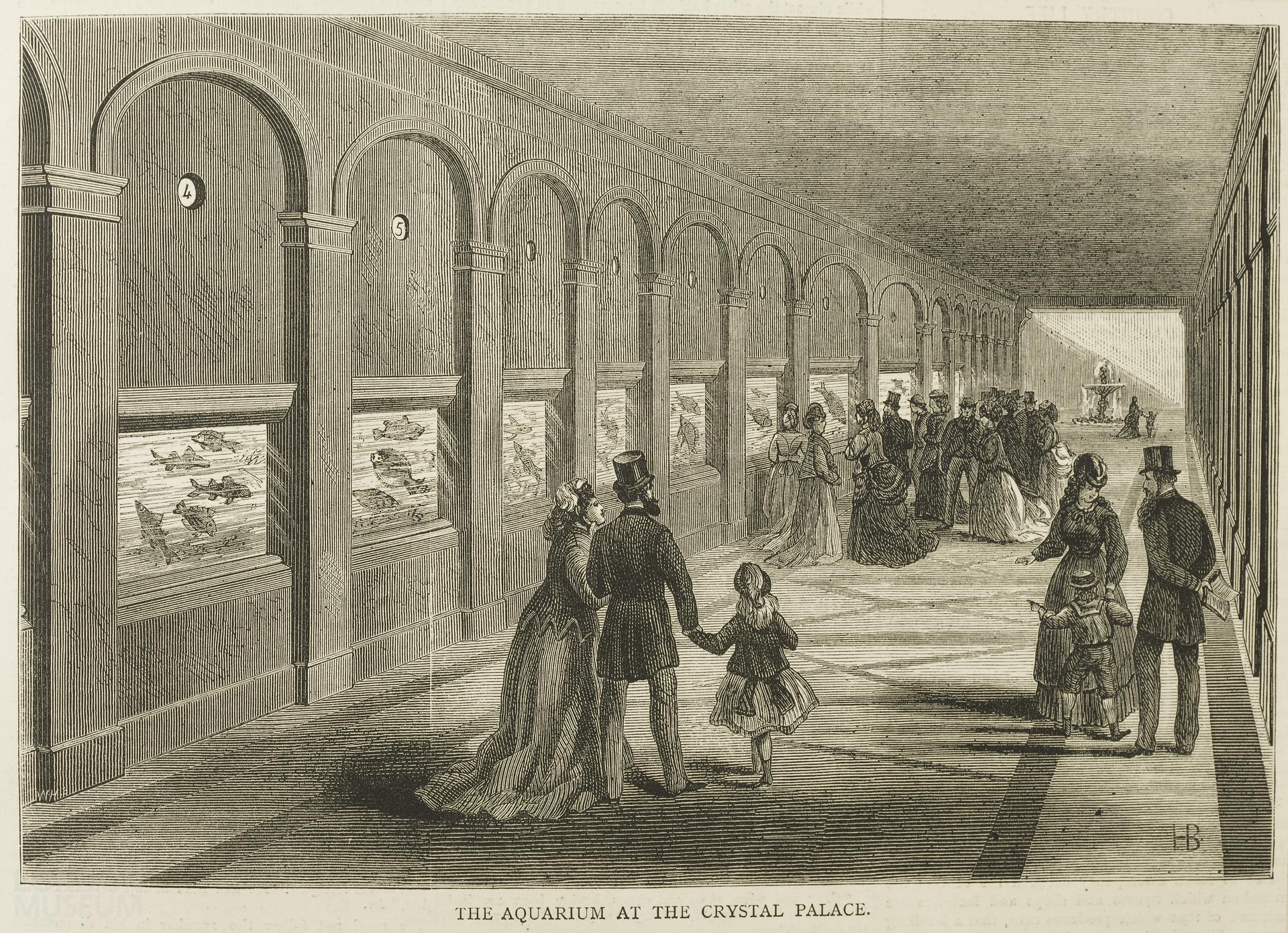Image of 'The aquarium at the Crystal Palace'. From: Pleasure Gardens of South London I. Bound volumes containing an extra-illustrated history of the pleasure gardens of South London, in typescript, page: 179.