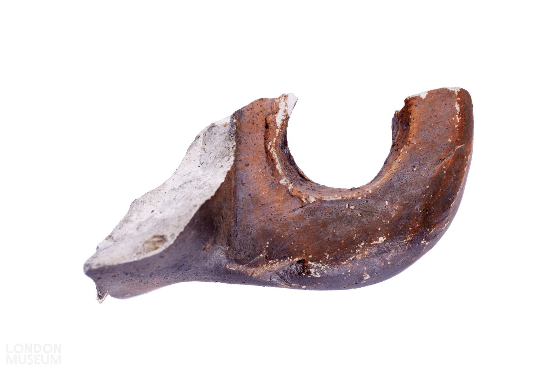 Incomplete type 11B ceramic open lamp, body and handle fragment in four joining pieces. Mould-made body with a rounded rim, the wall angled slightly outwards; flat base with circular foot ring. About half of the mould-made handle survives. Sooting on body and handle. Unsourced (?)imported fabrics (IMPT).
