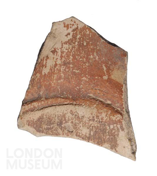 Incomplete ceramic probable picture lamp, body fragment. Part of the flat circular base defined by a groove. Central Gaulish colour-coated ware (other fabric) (CGOF).