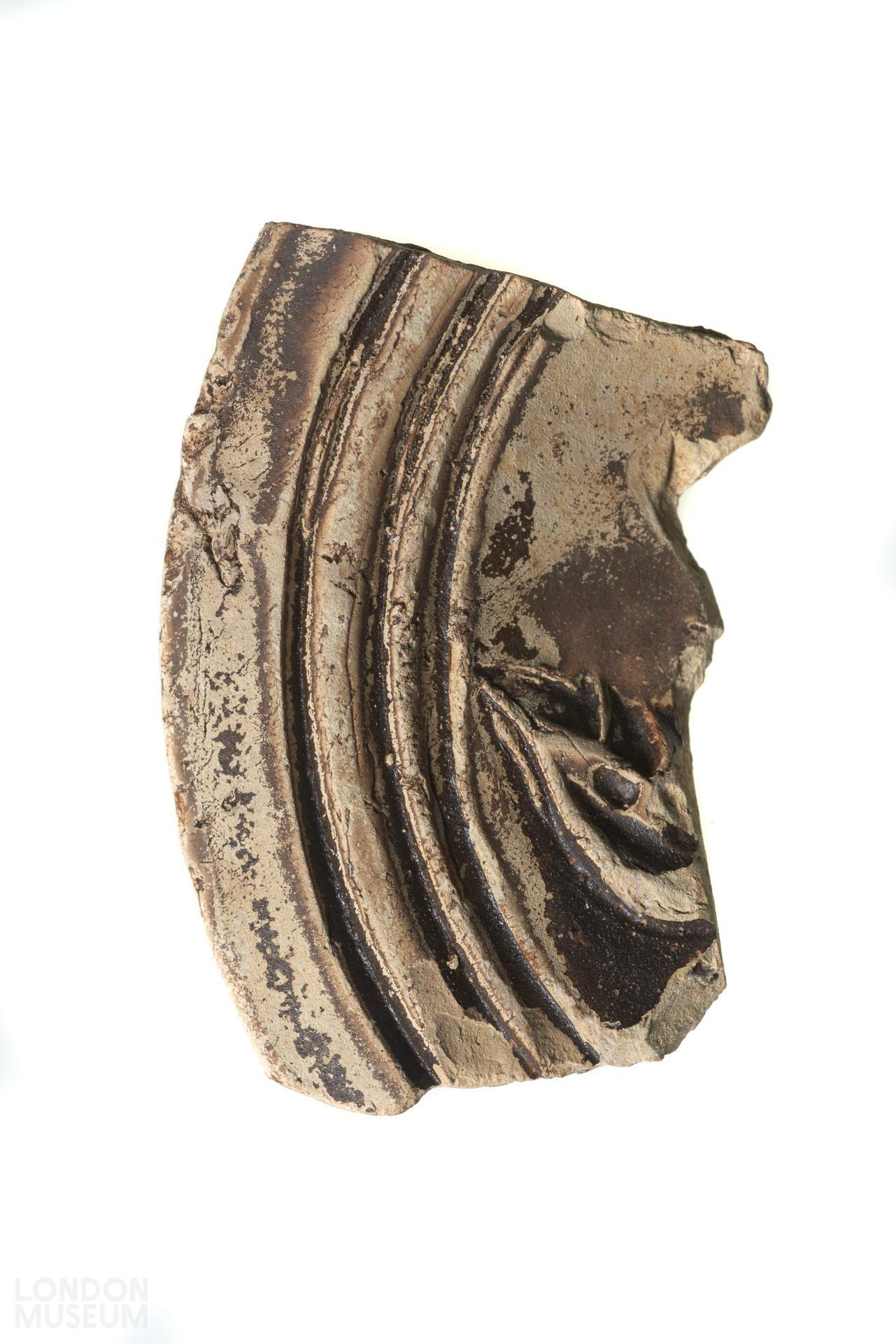 Incomplete ceramic picture lamp, body fragment. Part of the flat shoulder decorated with three concentric grooves at the border with the discus; part of the concave discus with an incomplete, blurred design, probably a leaf. Lyon colour-coated ware (LYON).
