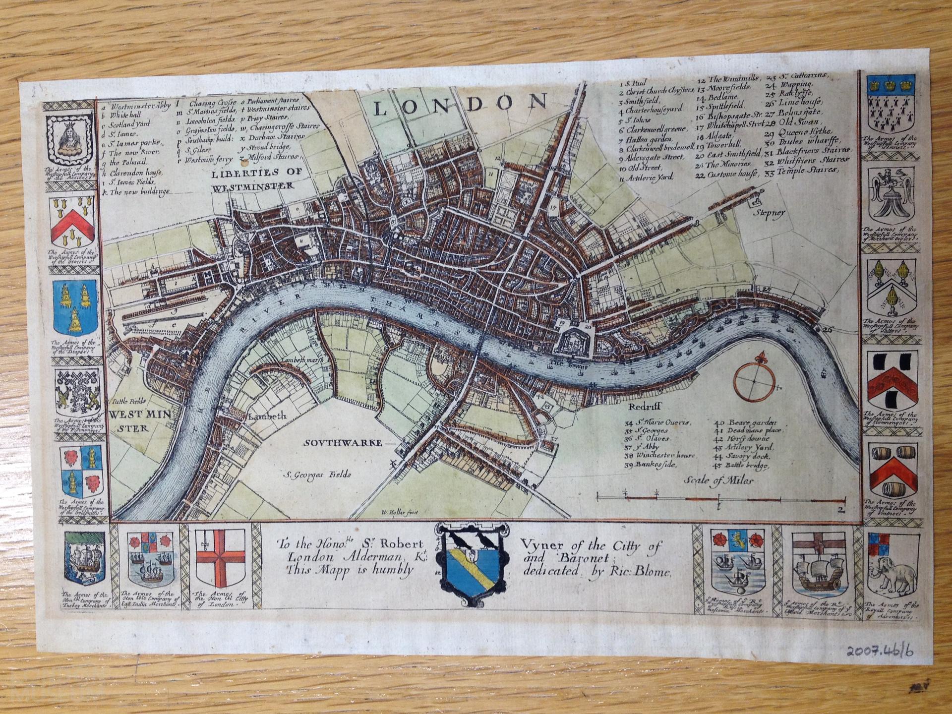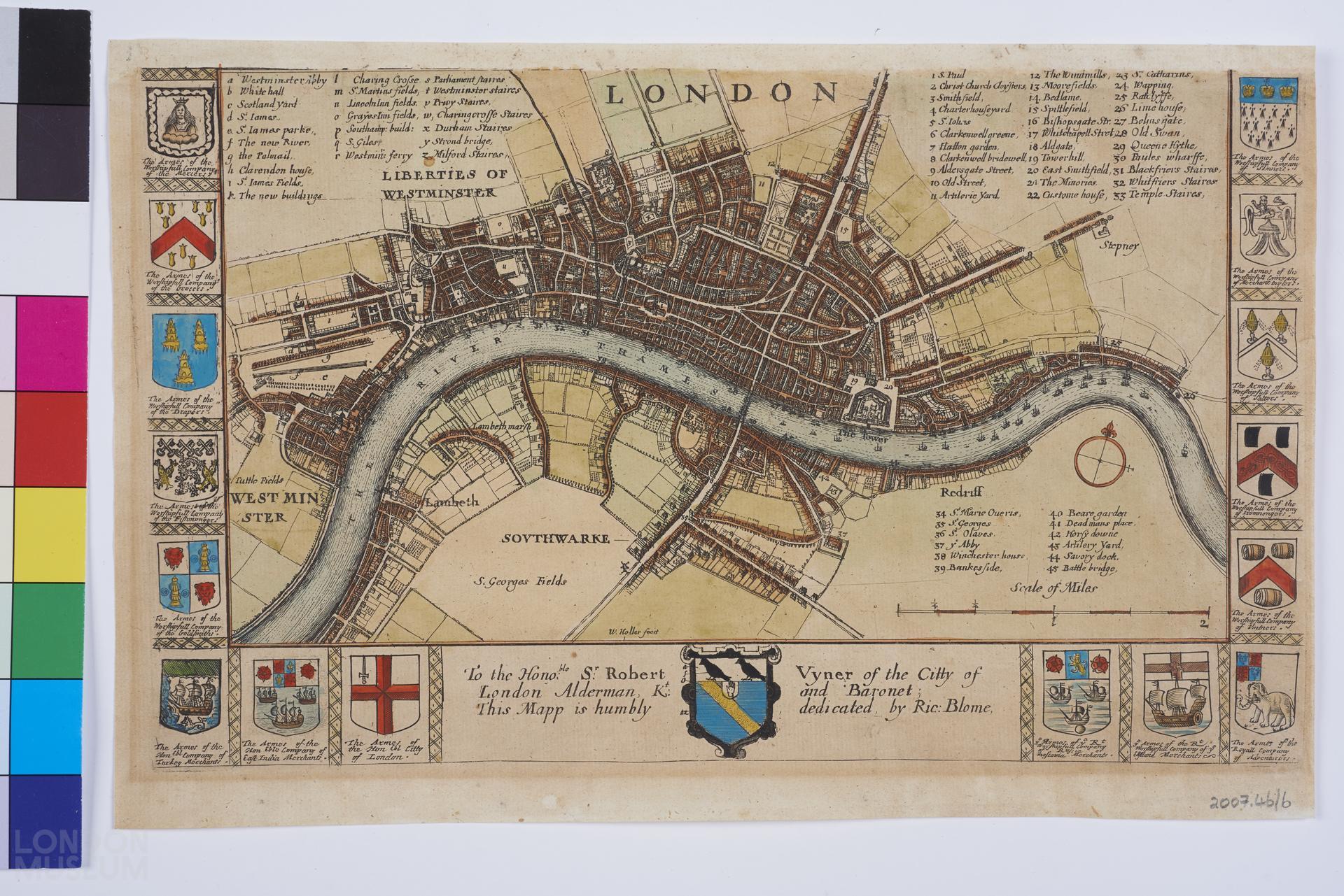 Map of London, dedicated to Sir Robert Vyner, showing coats of arms of City companies down both sides of map and partly along the bottom. Dedication to The Honorable Sir Robert Vyner of the Citty of London, Alderman, Knight and Baronet. This mapp is humbly dedicated by Ric. Blome. Vyner's coat of arms on panel in centre of bottom margin. Compass rose in angle of river. Engraved by W. Hollar. Darlington & Howgego no 15 edition 2.
