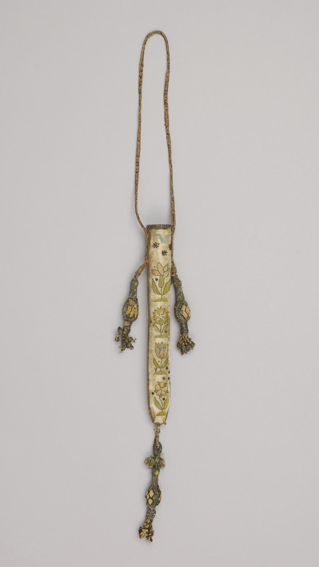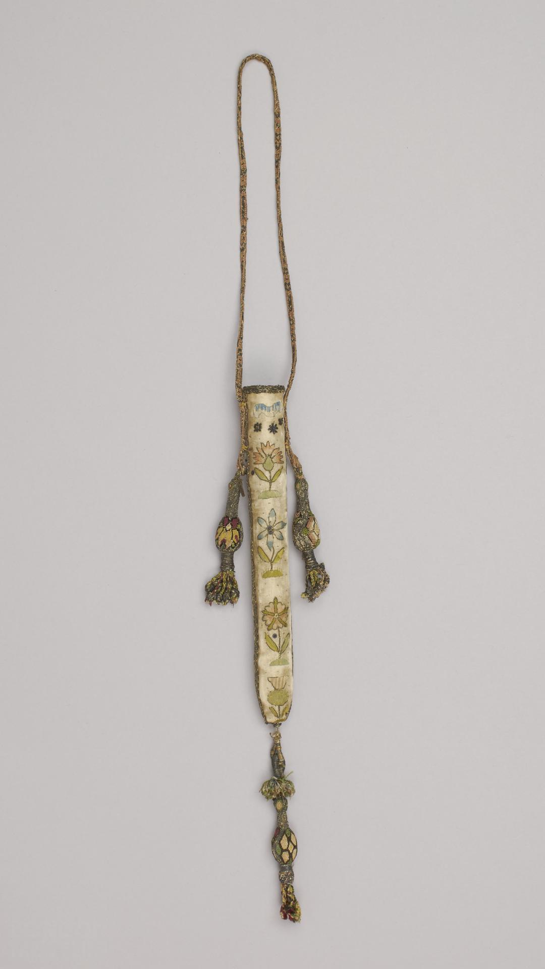 Catalogue notes by Santina Levey. Sheath-shaped knife case of card with two compartments for knives. Covered with cream satin and embroidered with green, pink, blue and cream silk in satin stitch. The motifs are outlined with couched silver thread and the ground is decorated with spangles, each secured with a piece of metal purl. The top and side seams are covered with silver-gilt braid. The lower end is decorated with two large interlocking loops of metal thread decorated with a short tassel of multi-coloured silk thread. An additional knob-tassel with an embroidered cover and plaited ends has been added at a later date. Two similar, but not matching, knob tassels have been attached to the plaited silk and metal thread handle, which is probably also a later replacement. Both sides of the case are decorated with a vertical row of four stiff floral sprigs (thistle, rose, carnation, tulip and unidentified flowers) surmounted by a stylised cloud and rain drops. Condition: fairly good. The satin cover is begining to split. Many of the spangles are missing. The threads holding the loops at the bottom end are separating.