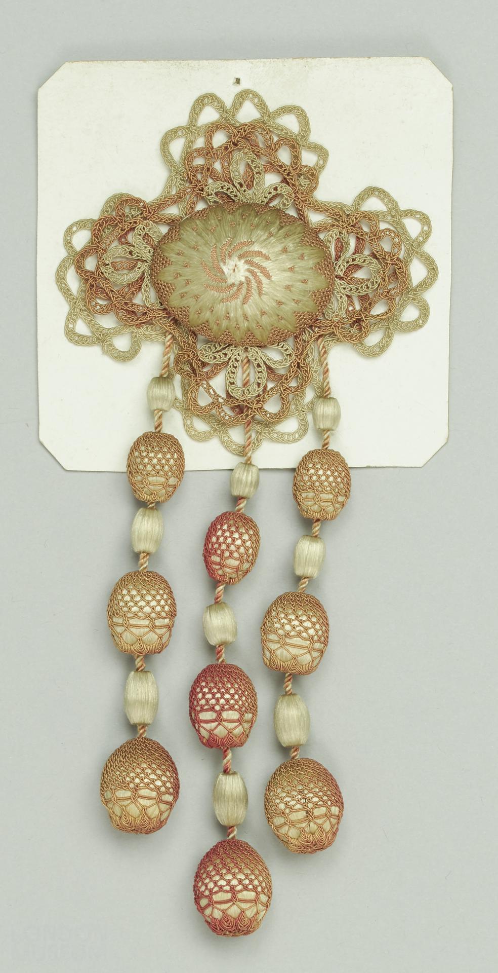 Cerise and white frog with pendants. Button with tassel. Relating to Great Exhibition Exhibitor.
