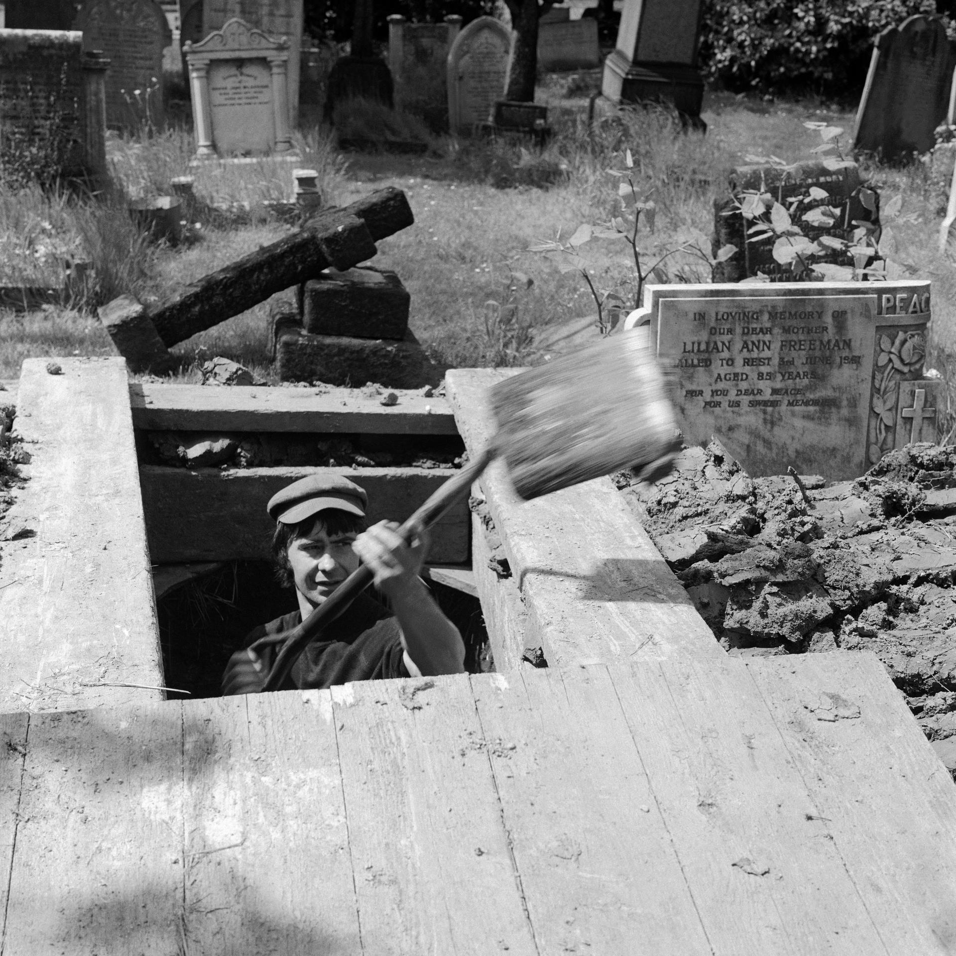 A gravedigger excavates a plot in preparation for a funeral. One of a series of images taken by Henry Grant of outdoor trades and occupations.
