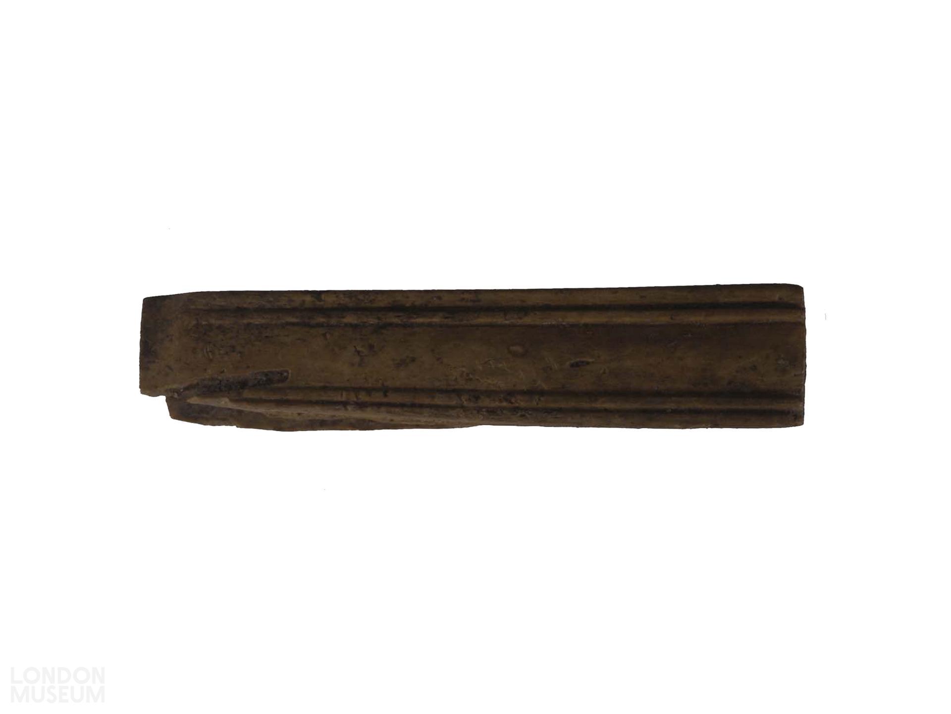 Knife handle, incomplete; made from a long bone, squared externally, one side broken. Two opposing sides are decorated with a cordon along each edge; the remaining face is plain; one end slightly tapered and shaped fro the blade. Possibly for a knife of Manning Type 1.