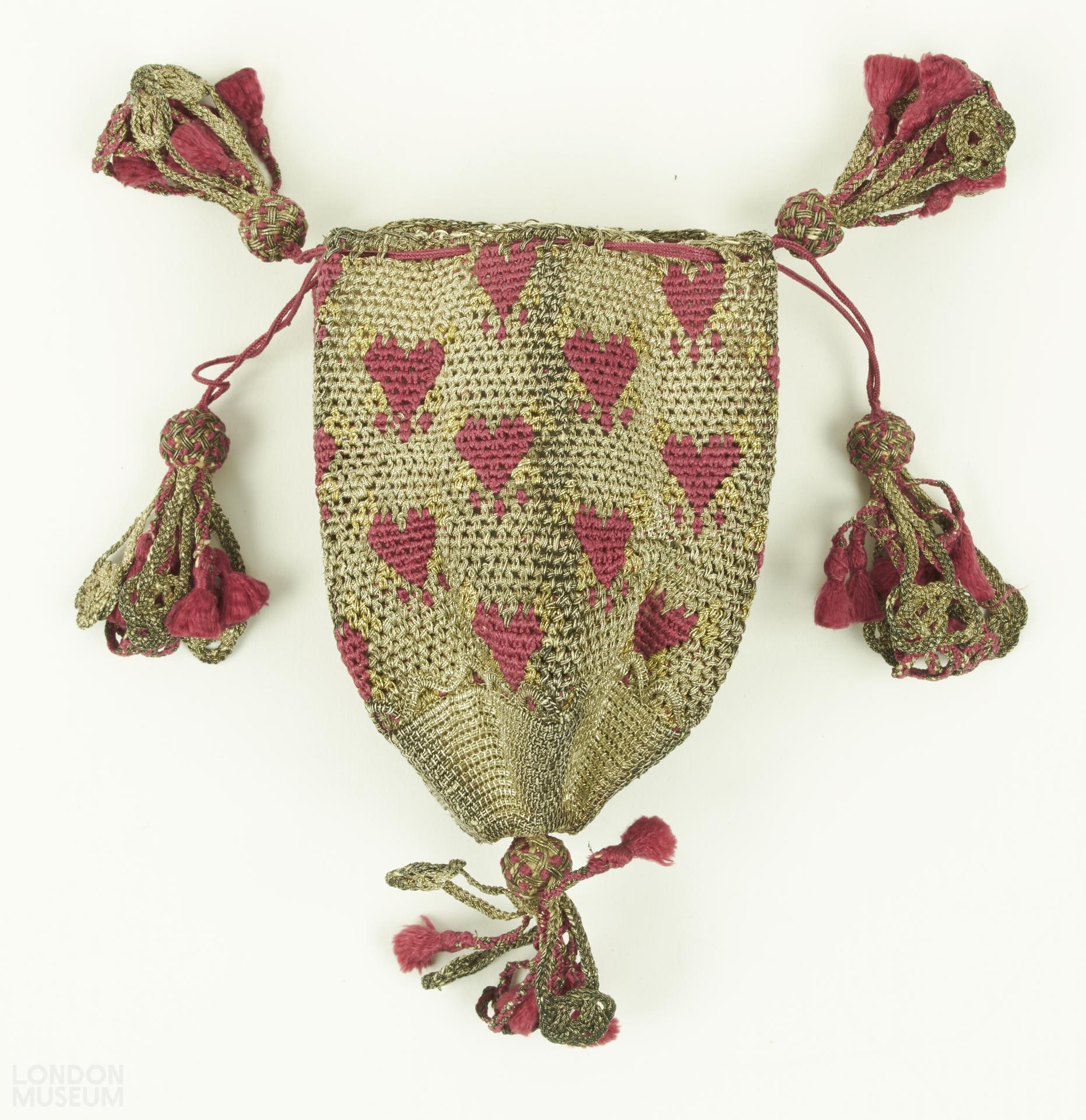Catalogue note by Santina Levey. A cylindrical purse with a rounded base and drawstring top. It was made on a purse mould with silver and silver-gilt thread and red silk in detached buttonhole stitches. All the threads are carried round the mould and brought to the surface as required; each loop is worked with paired threads and the underlying threads are invisible except in places on the back. The roundel at the base is worked only in silver thread in detached buttonhole stitches over pairs of laid threads, and is lined with tightly and separately worked linen thread buttonholing. The thin drawstrings are of fine red silk plaited with a square cross section. They are trimmed with four elaborate tassels of plaited silver and silver and red silk braids with interlaced ends and plaited red silk and silver thread tufts, all bound into small balls covered with red silk and silver thread. A fifth matching tassel decorates the end of the purse. The main body of the purse is patterned with small red hearts surrounded by red and gold spots. The join between the main body and the base is trimmed with a series of loops oversewn with buttonhole stitches. Condition: good. Some of the silver thread is slightly tarnished.