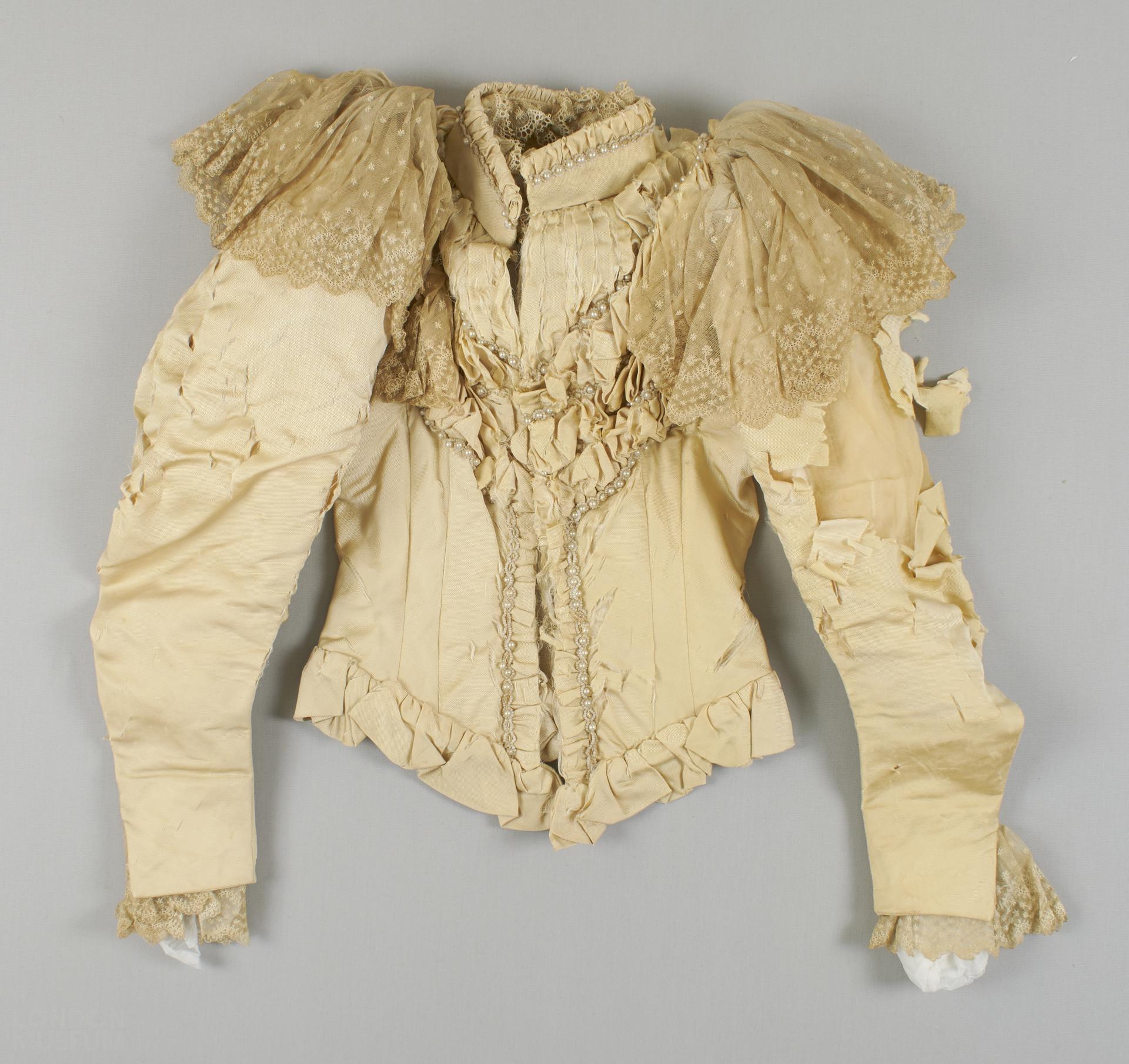 Off-white silk satin woven in a cannelé pattern; stiffly boned, fitted bodice. Tall, stiffened stand collar topped with a self ruffle plus a narrow net ruffle and trimmed with a strip of beading. Gigot sleeves surmounted by floppy net ruffles gathered into armholes, narrower ruffles of the same at wrist. Sleeves interlined with stiffened muslin. Centre front opening fastened with hooks and eyes alternating in groups of four, trimmed with self ruffle and beading. Yoke trimmed with rows of self ruching divided by strips of beading. Back set into collar in four box pleats which narrow as they descend becoming six small stitched down tucks at the small of the back continuing to bodice hem. The two side back seams are beaded. Hem trimmed with self ruffle and beading. Lined with cream coloured twilled cotton;13 bones, one at each seam and on either side of opening. Jersey dress shield tacked at each armhole. Satin-faced waist tape tacked to two centre back bones fastening with three pronged buckle. Dress shields stamped 'Mozambique/patented/made in USA'.