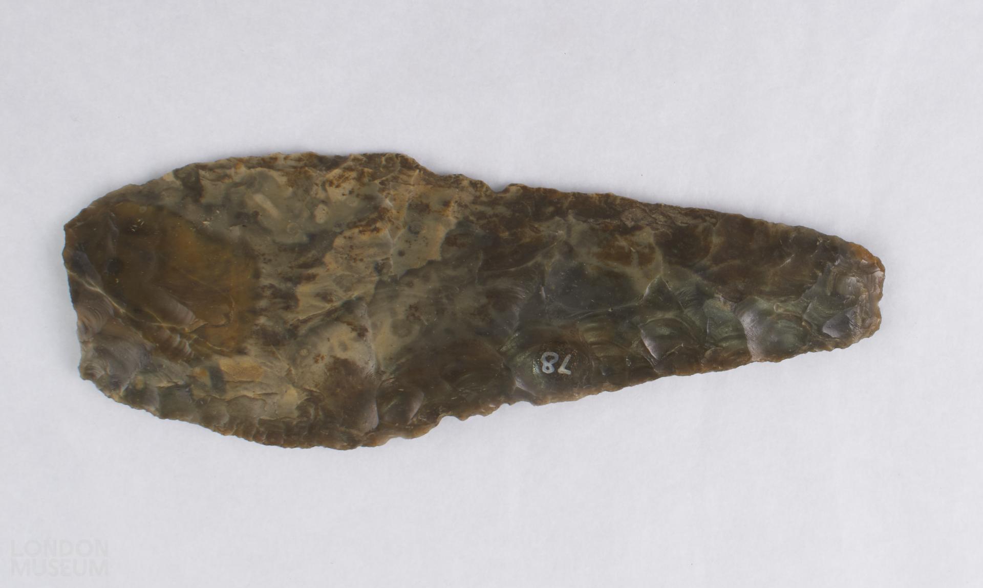 Leaf-shaped dark brown and grey flint dagger.