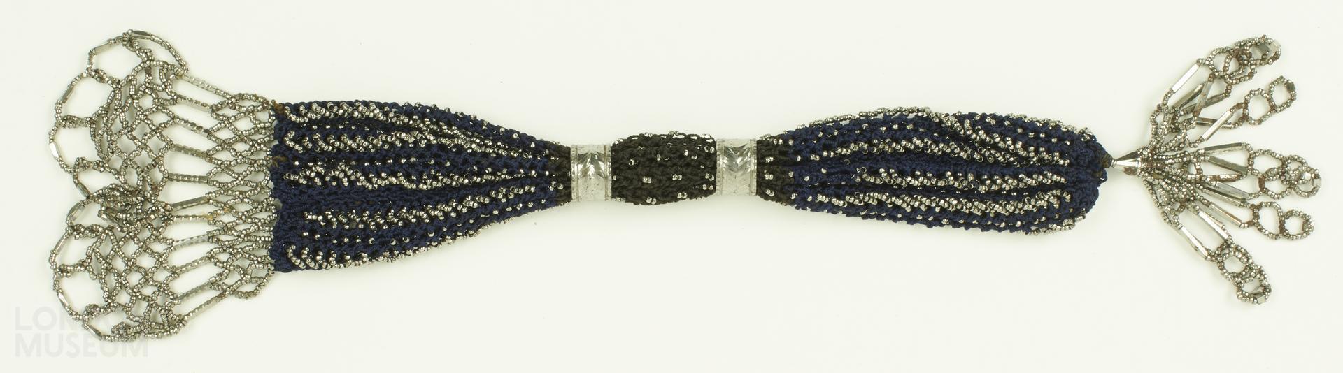 Miser purse, made from dark blue silk with a black crocheted silk central panel, with silver metal beaded lengthwise stripes. One silver coloured tassel and one silver coloured bead fringe at either end. One concave ring with branching decoration - 11 mm wide and 15 mm diameter.
