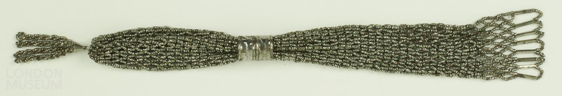 Green coloured silk net miser purse decorated with silver coloured cut steel and other beads, With a silver coloured beaded tassel to one end and a flat beaded netting to the other. With two silver coloured metal rings. Late 18th and early 19th century.