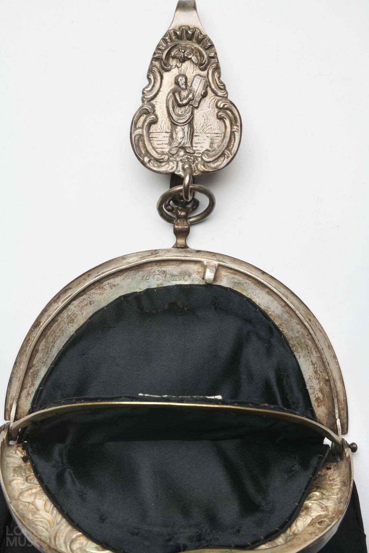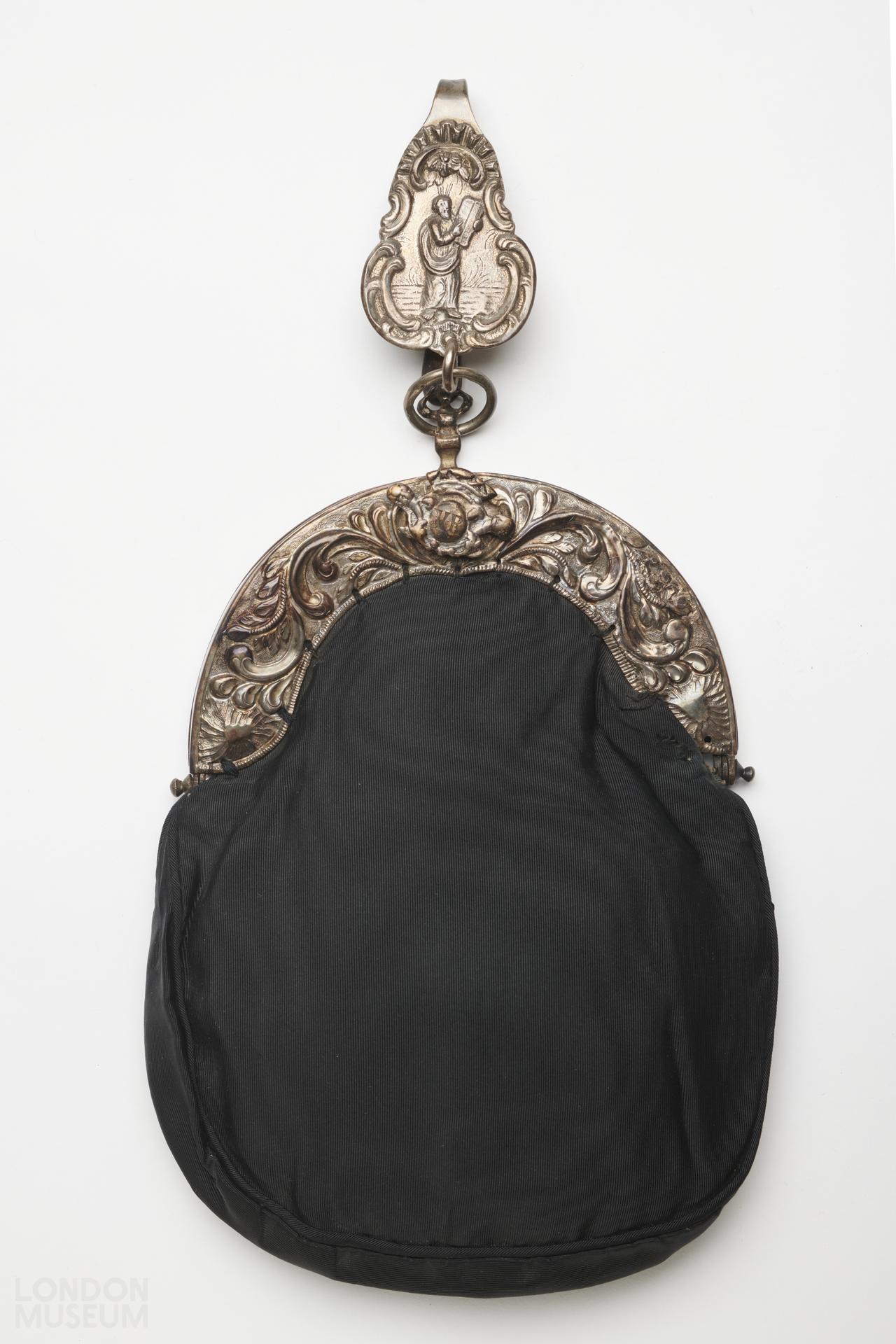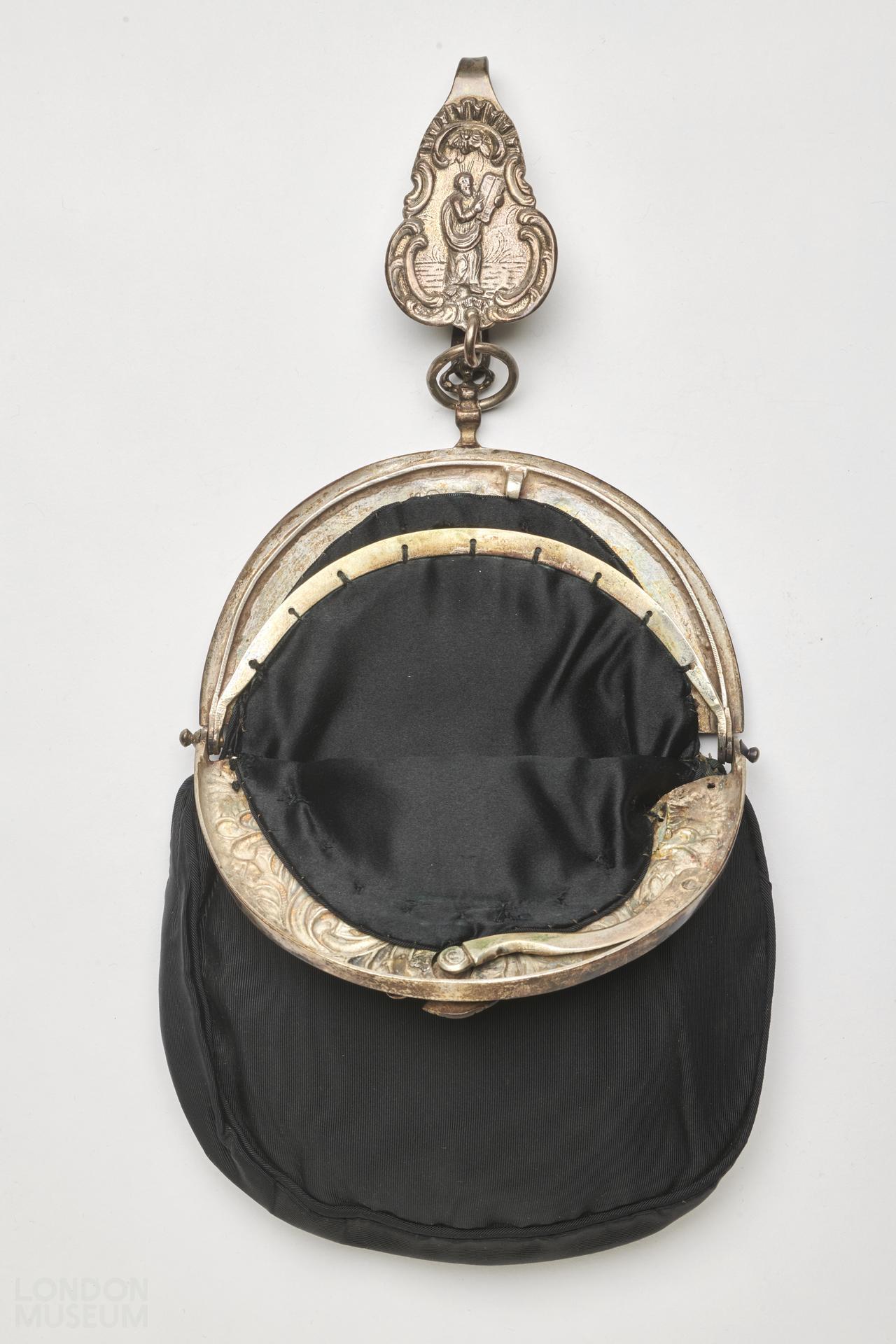 Rounded chatelaine bag of black corded silk trimmed with piping. Back and front are both in one section. Bag features a repoussé silver(?) frame, with "VR" on catch; hook for attaching to belt. Two compartments inside. Black satin lining.