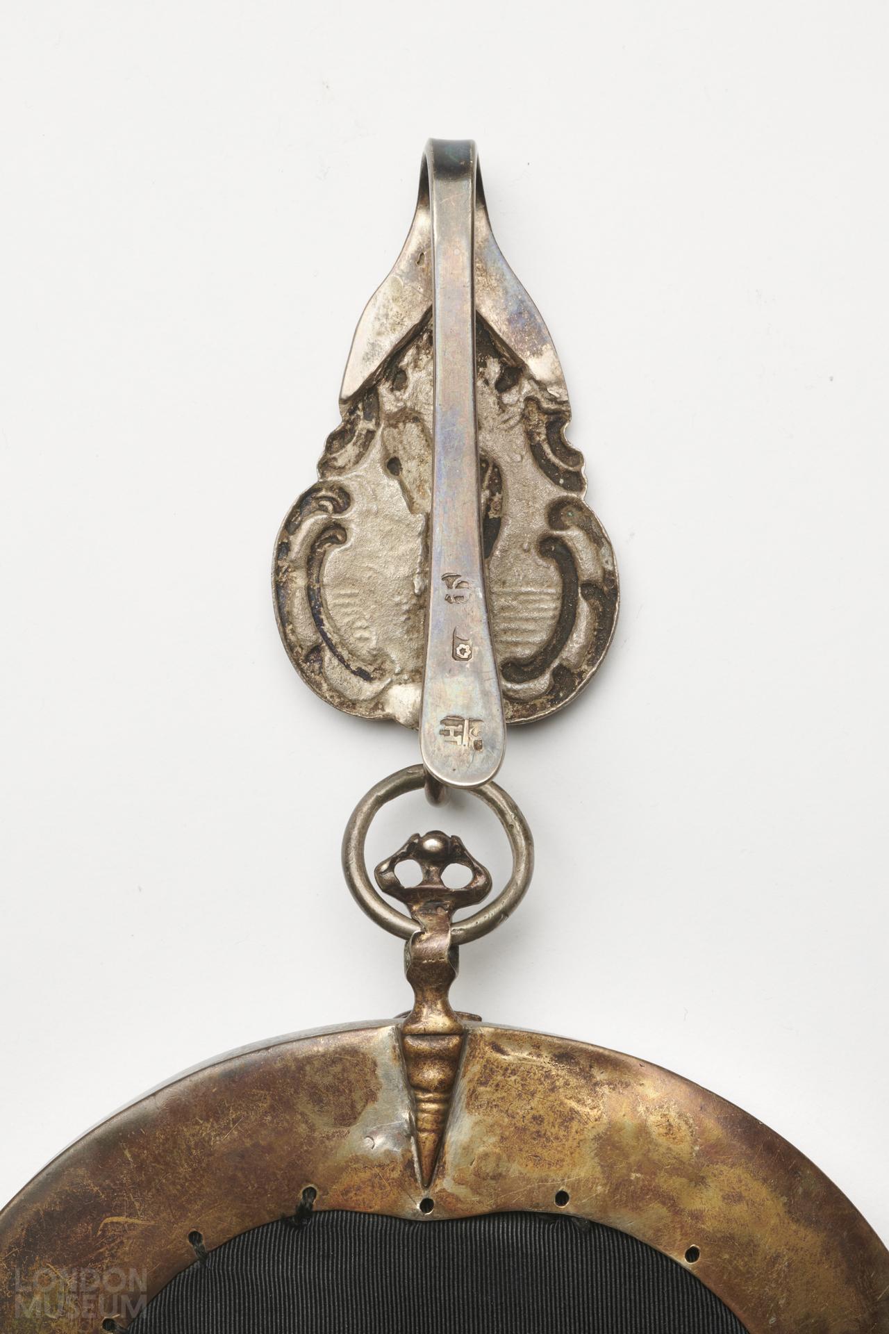The frame has the makers mark IIF for Jan Jacob Fels, the location mark for Kampen, Holland (triangle in circle); the date mark C for 1810 and the number 10 for '10 penningen' or 833.33 fineness. The hook has three further markes on the back but they are partially washed off and so far it has not been able to identify them.
