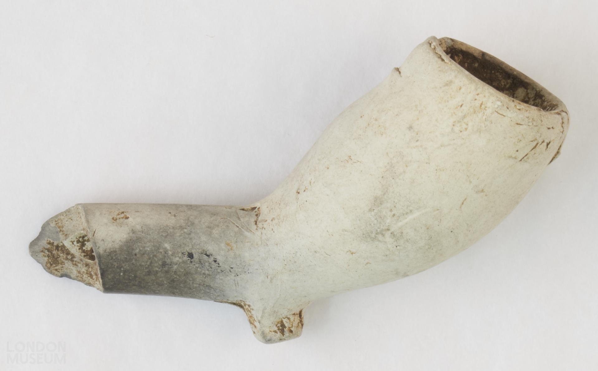 Incomplete clay tobacco pipe. Bowl with small heel and part of stem remaining. No mark. No milling around rim. Letter 'L' written in pencil on pipe.