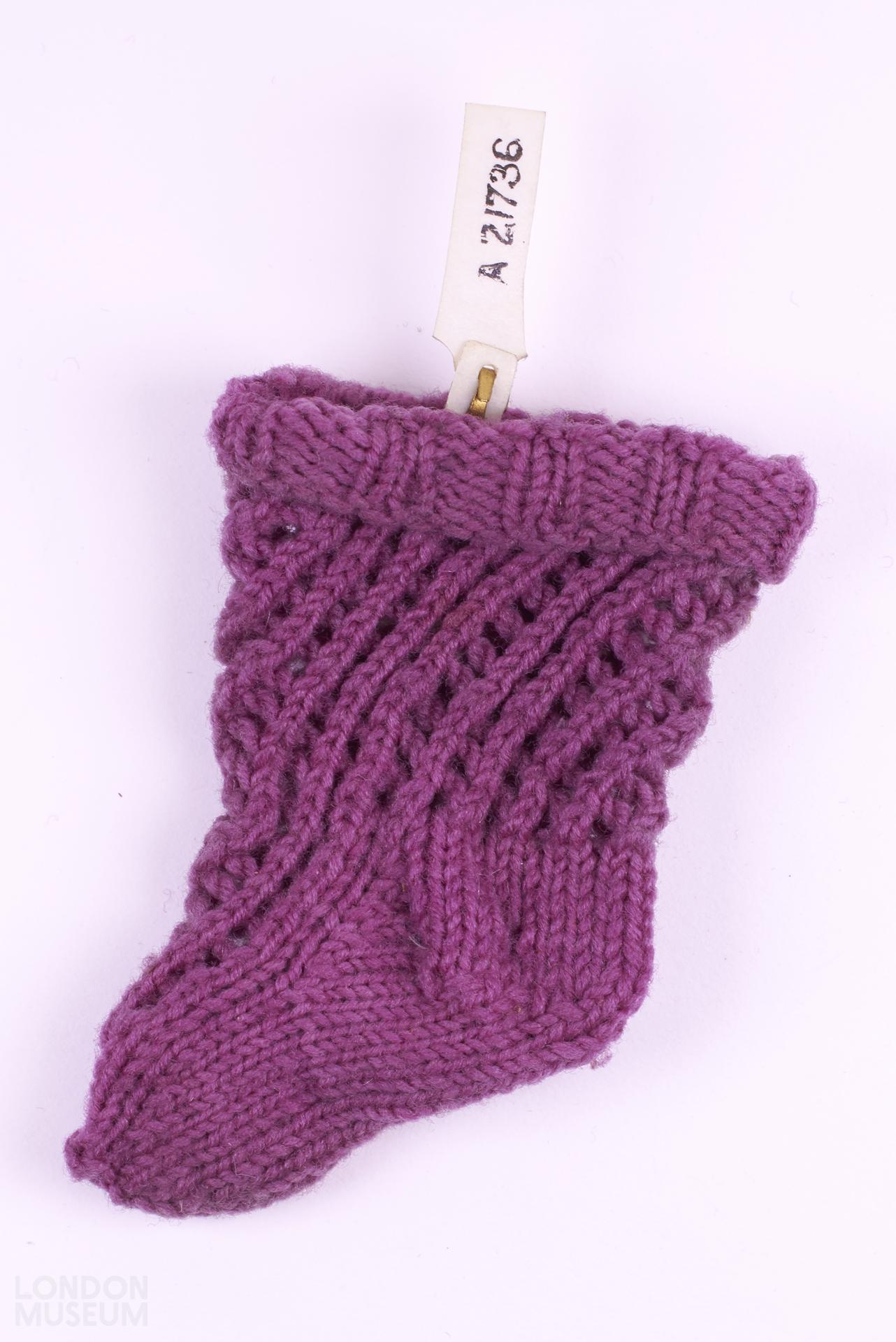 One of a pair of doll's knitted woollen bootees dyed purple.