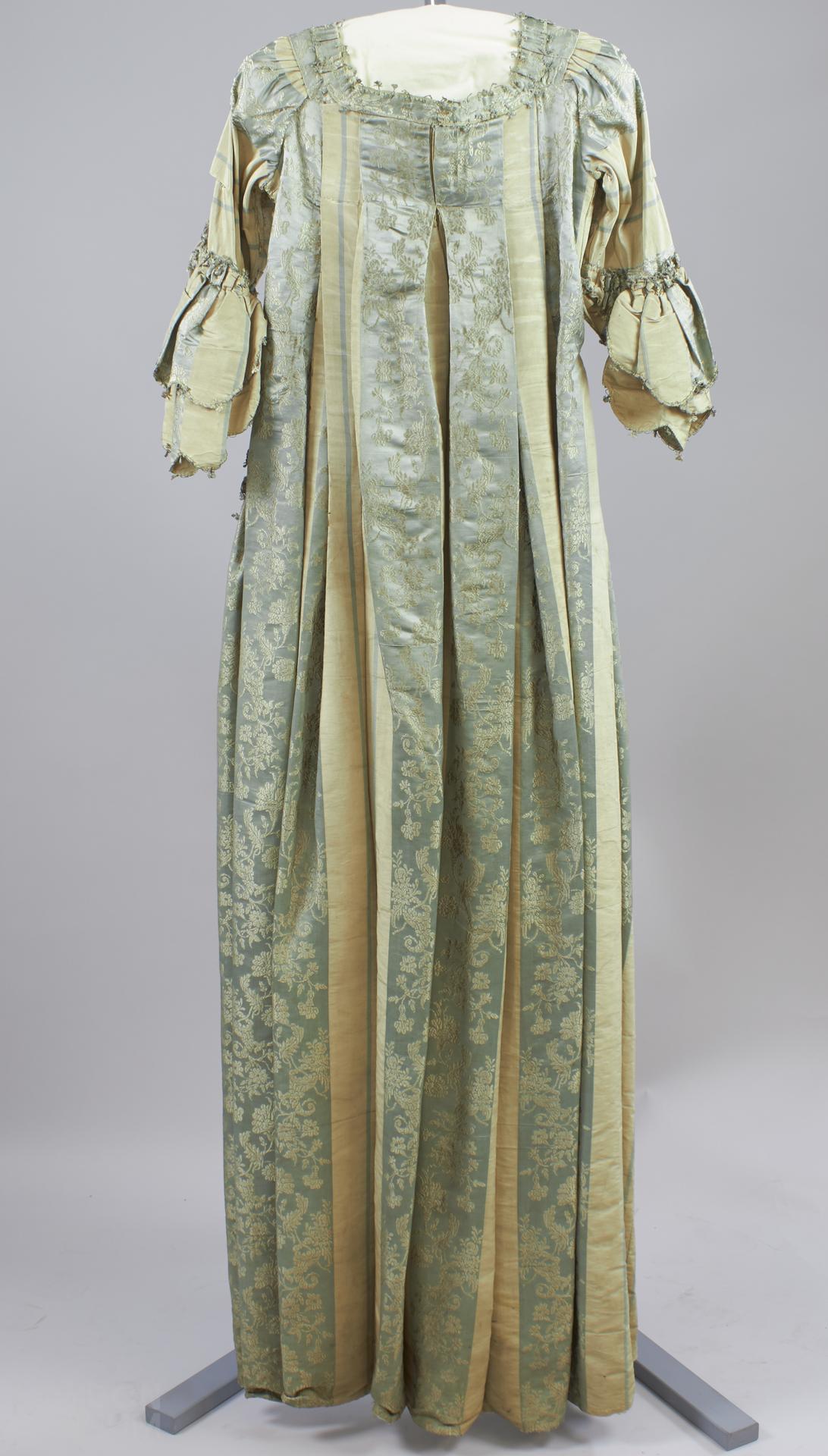 Robe of white corded watered silk striped pale blue satin figured cornucopia and flower sprays. Sack back; elbow length sleeves with double scalloped frills; trimmed ruched band of self fabric edged with blue and white tasselled braid. Stomacher added later. Original muslin ruffles detached for washing Dec 1966. Condition: very soiled and split.