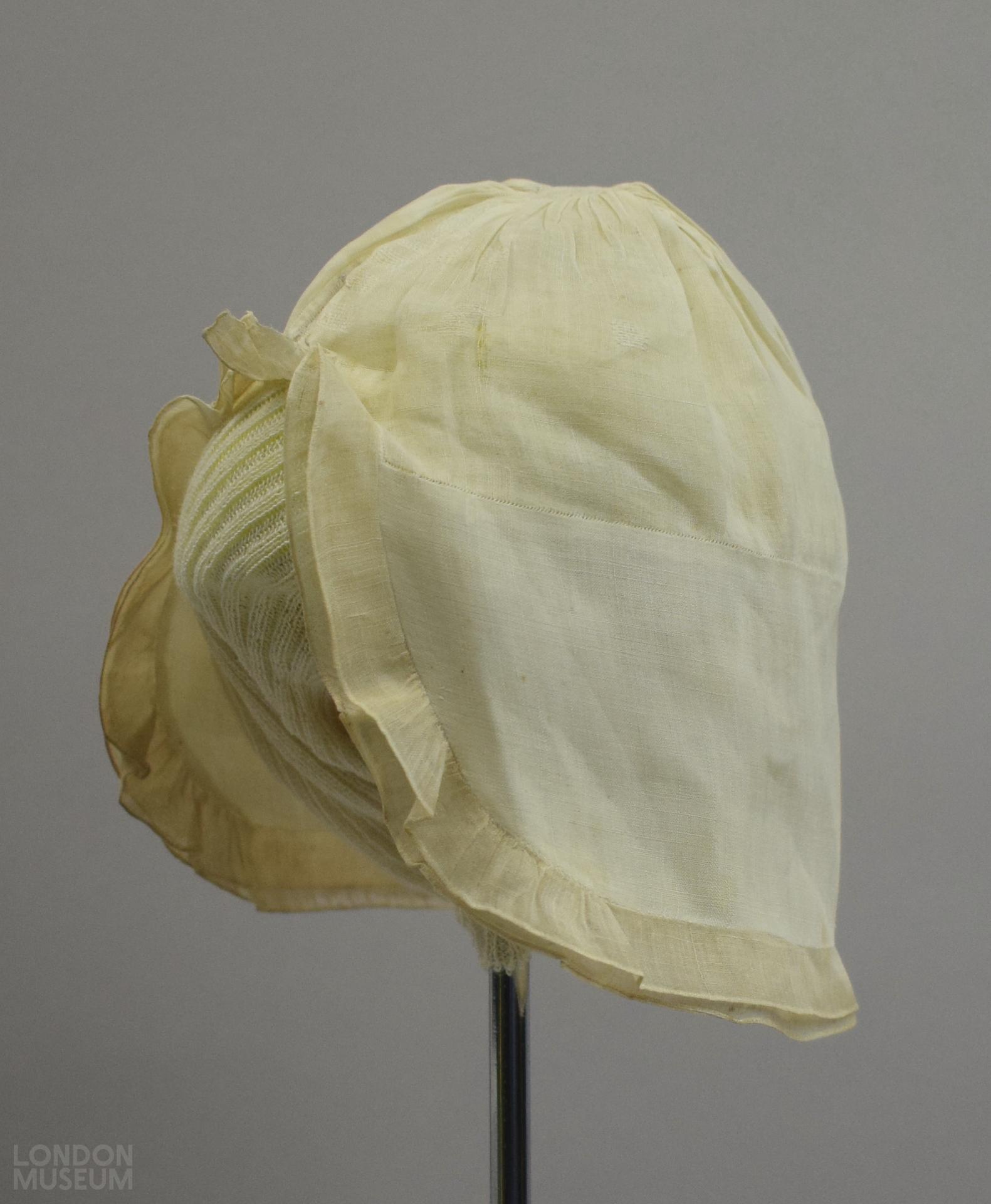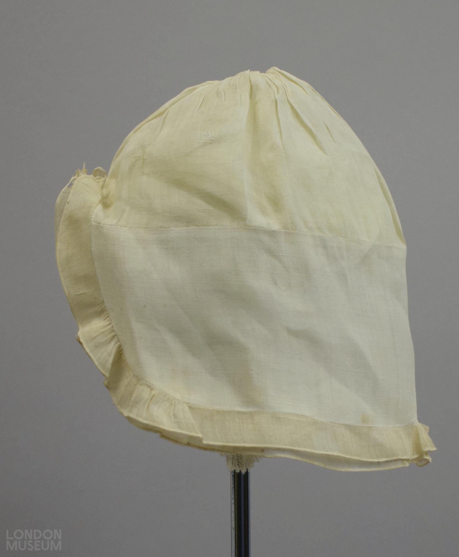 Baby cap of the Duke of Gloucester, son of Queen Anne, with manuscript note dated 1819 giving their history.