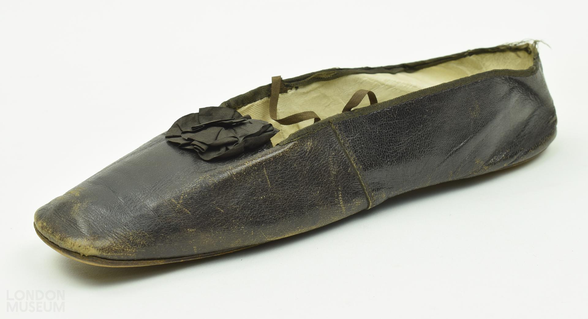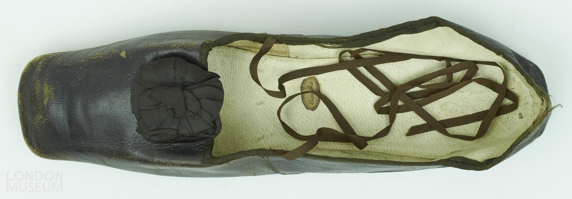 Woman's single brown glace kid shoe with brown silk ribbon rosette on the toe, and thinner ribbons to tie. A small paper label stuck on the insole lining reads 'Gauche'. Lined with white kid in the quarters and sock, lined with cream glazed cotton in the vamp.