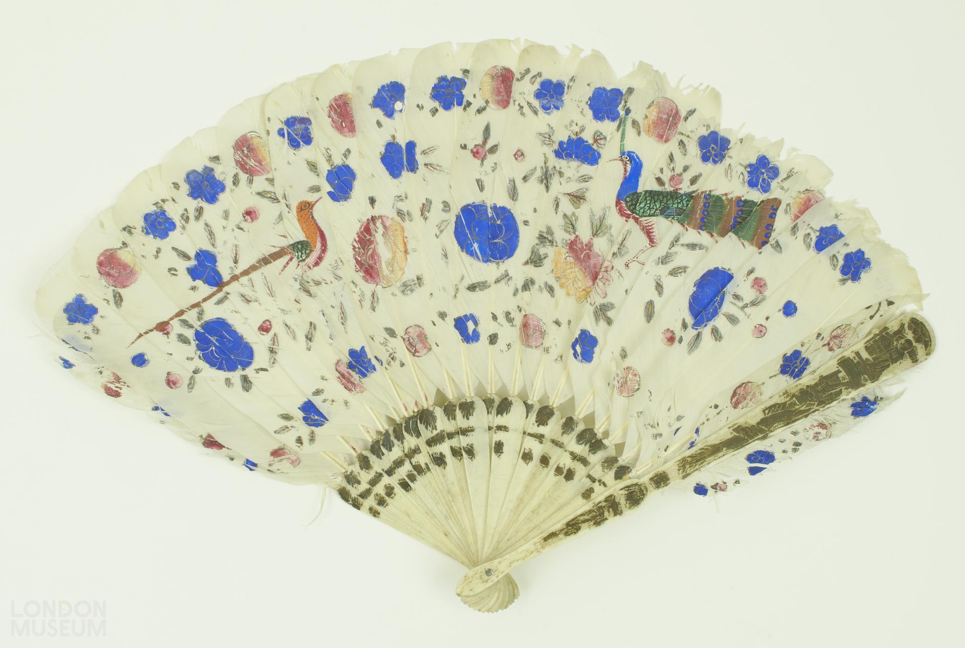 Fan of mounts of white feathers, painted both recto and verso with blue, pink and yellow flowers with silver leaves, and two exotic birds (recto) and orange butterfly (verso). Bone sticks and guards with simple design of shallow carved lines and decorated with gold, now tarnished.