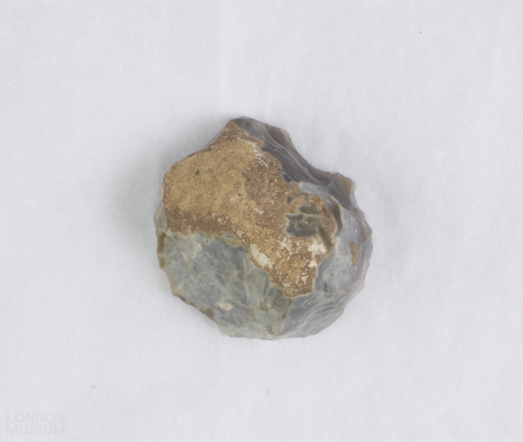 Steep sided core scraper. Flat side is varying shades of grey in colour with white. The side with grooved edges is grey, brown and beige in colour.