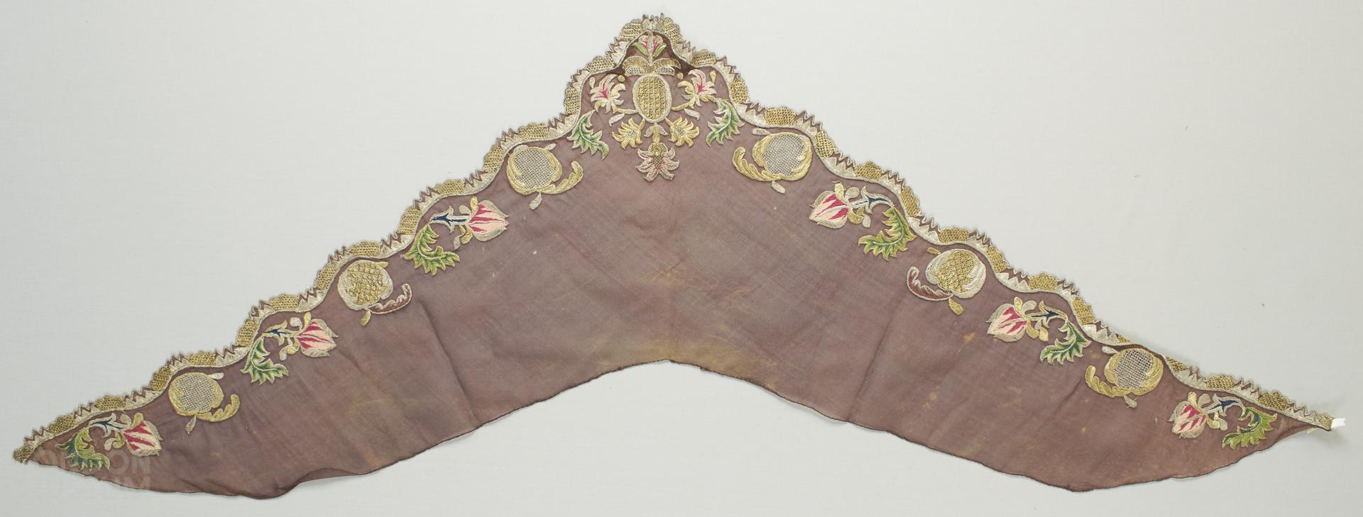 Purple/ brown sheer silk muslin ground, heavily embroidered at the lower edge with gold and silver threads and polychrome silk threads worked in satin stitch, basket weave, Holbein (?) stitch, drawn thread. The embroidery encompasses the lower hem; the upper hem is rolled and whip stitched with dark brown silk thread. Alteration Notes: there is substantial darning at the centre back lower pointed edge