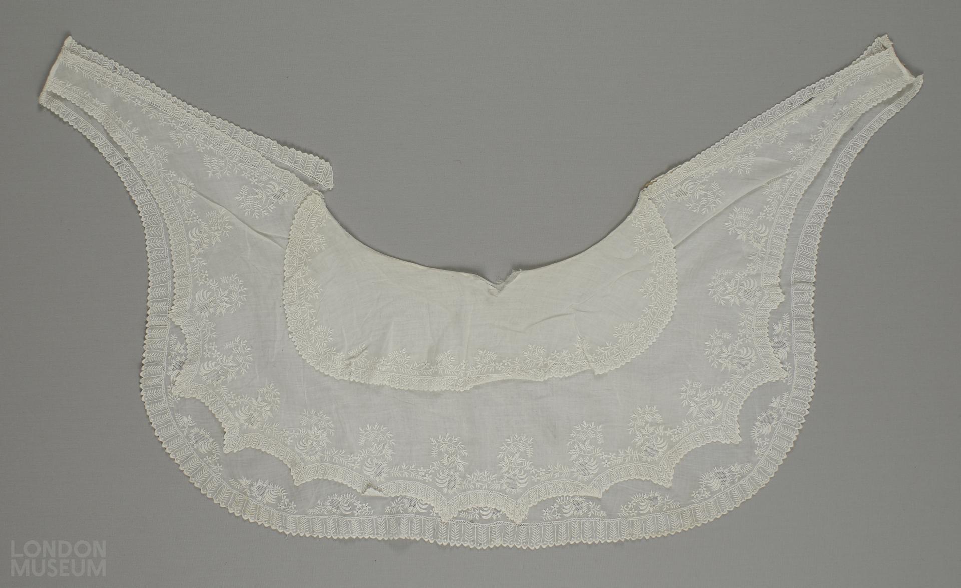 Embroidered muslin deep collar with ties in front for pinning, three layers, embroidered trim with fine floral design.