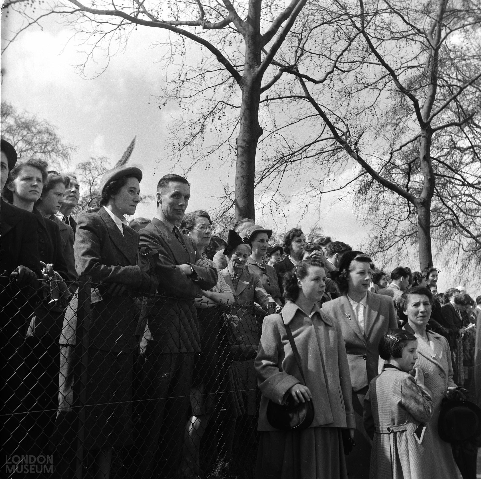 Crowds watch the Easter Parade in Hyde park in April 1952. The weather was glorious for the parade and the Times newspaper reported that temperatures reached 70 degrees. Thousands of people watched the parade and listened to the Irish Guards Band play.