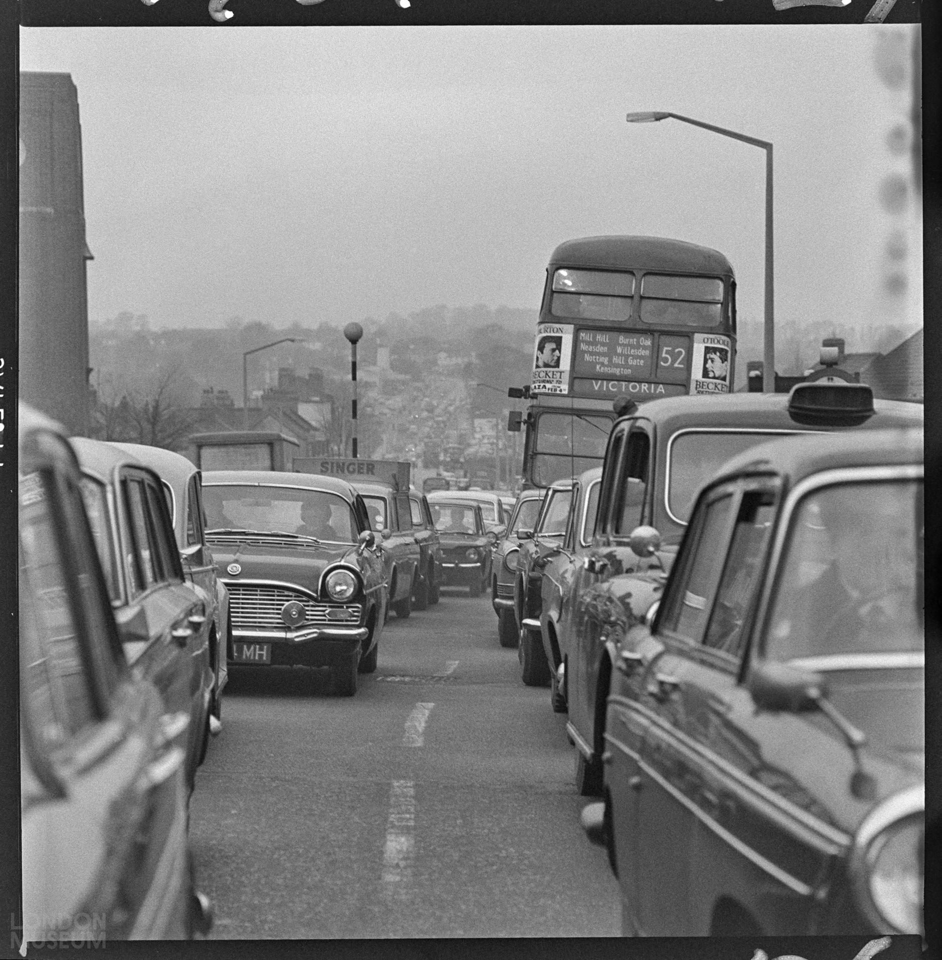 Traffic on Neasden Lane, February 1965. The No 52 Bus to Victoria can be seen in the traffic jam.