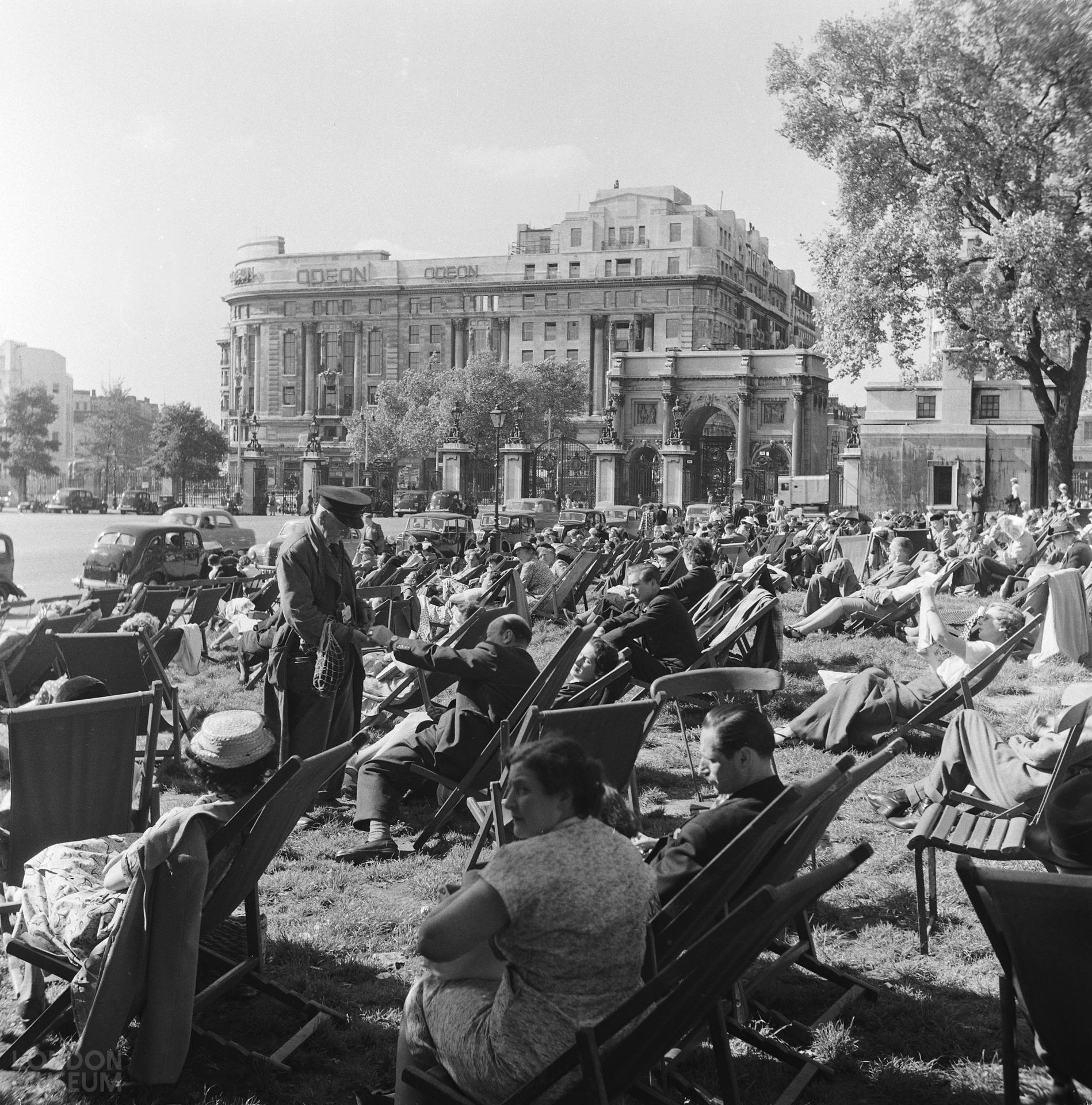 People sunbathing in Hyde Park with Marble Arch and the Odeon cinema in the background. The attendant is selling tickets for the deckchairs which are available for hire in the park. The Odeon which was originally a ‘Regal’ cinema, opened in 1928. The façade of the building was made from Portland Stone and featured columns and statues however in 1964 it was thought too small and the building was demolished and a larger cinema complex was built in its place.