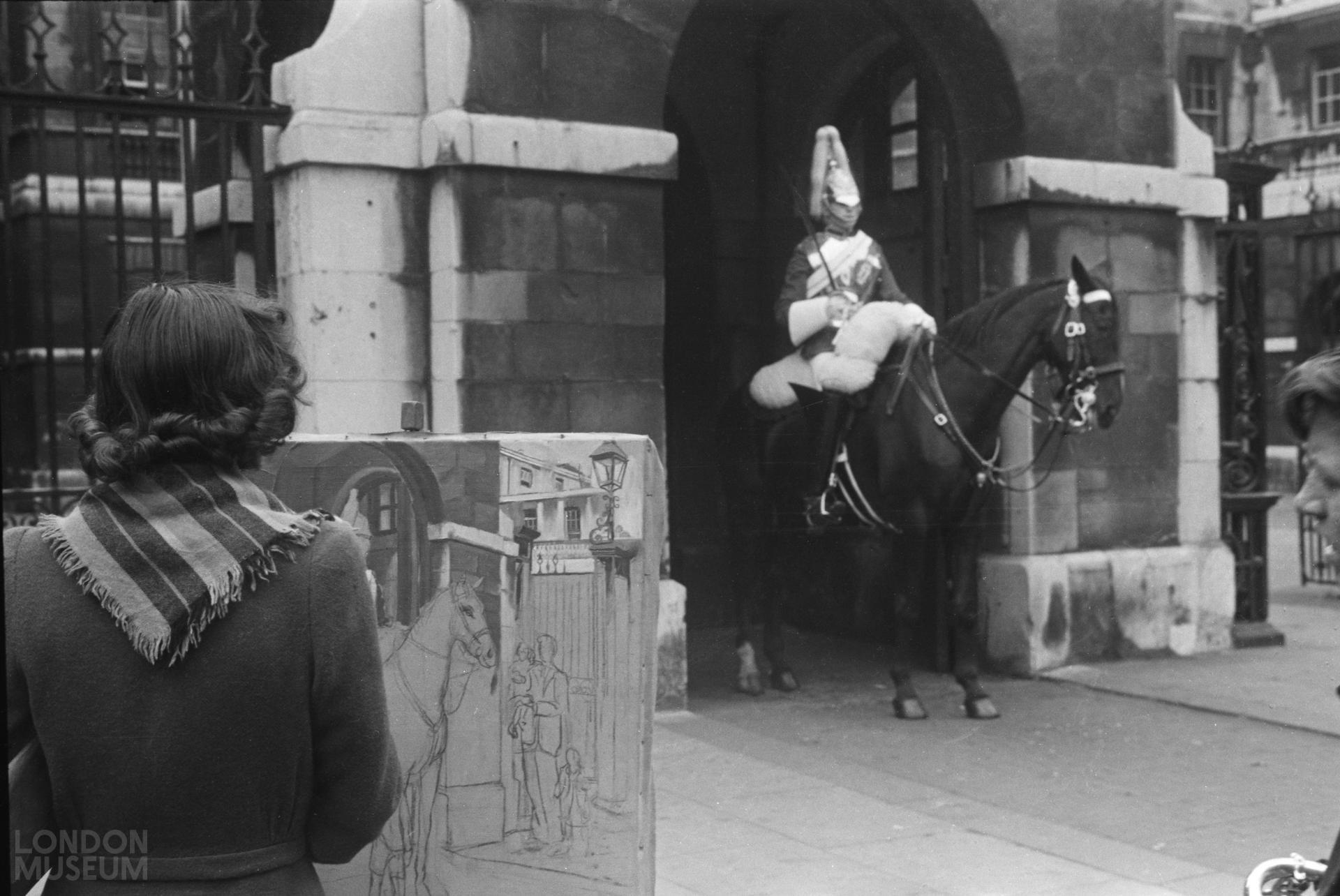 Artist painting a guard on horseback at Horseguards parade. The arches are the official entrance to Buckingham and St James’ Palaces and apart from Royalty and cavalrymen on duty you need permission from the Queen to ride or drive through the arches. Visitors and tourists have traditionally tried to make the stoic guards laugh.