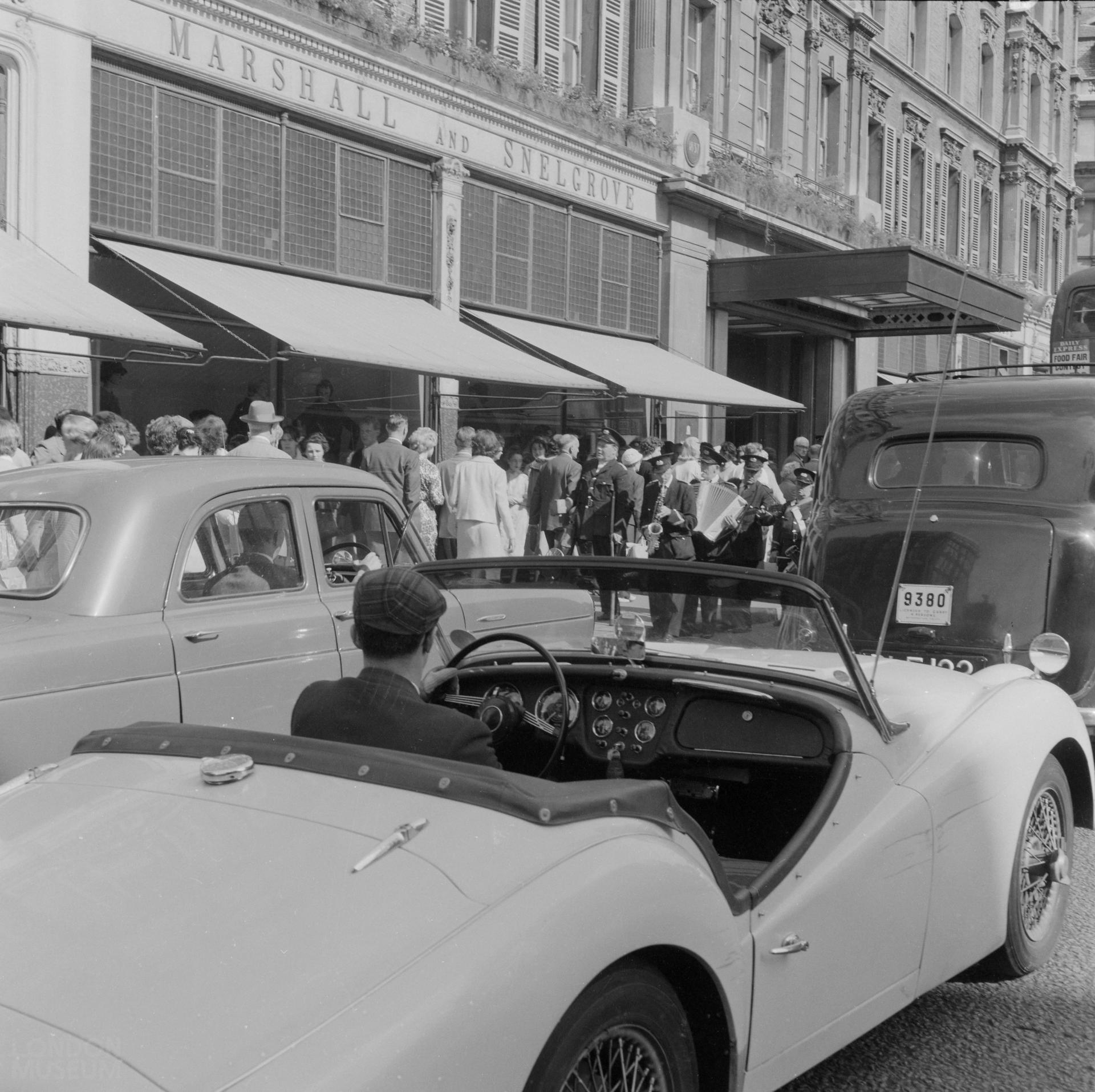 Traffic and people outside the former 'Marshall and Snellgrove' department store on Oxford Street. The store was located on the corner of Vere Street and Oxford Street. The building was designed by Sir Horace Jones in 1870. The company struggled during the First World War and in 1919 merged with Debenhams but the Oxford Street store was not redesigned until 1973 so the original name remained on the outside of the store.