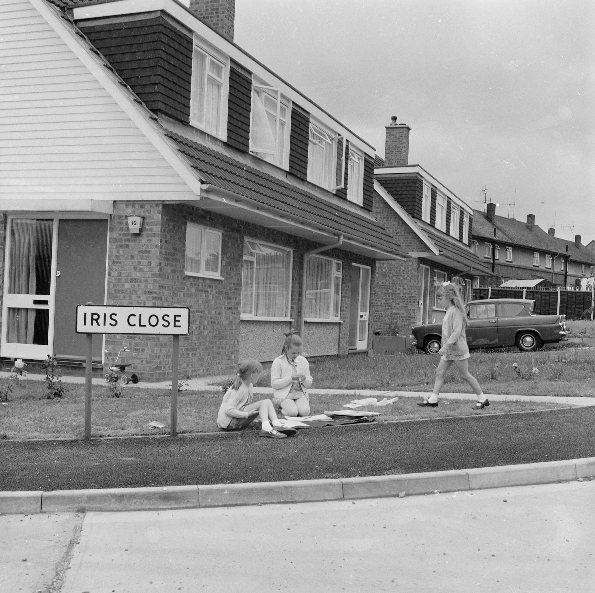Girls playing outside their house in Iris Close on the Waites Estate, in Brentwood.