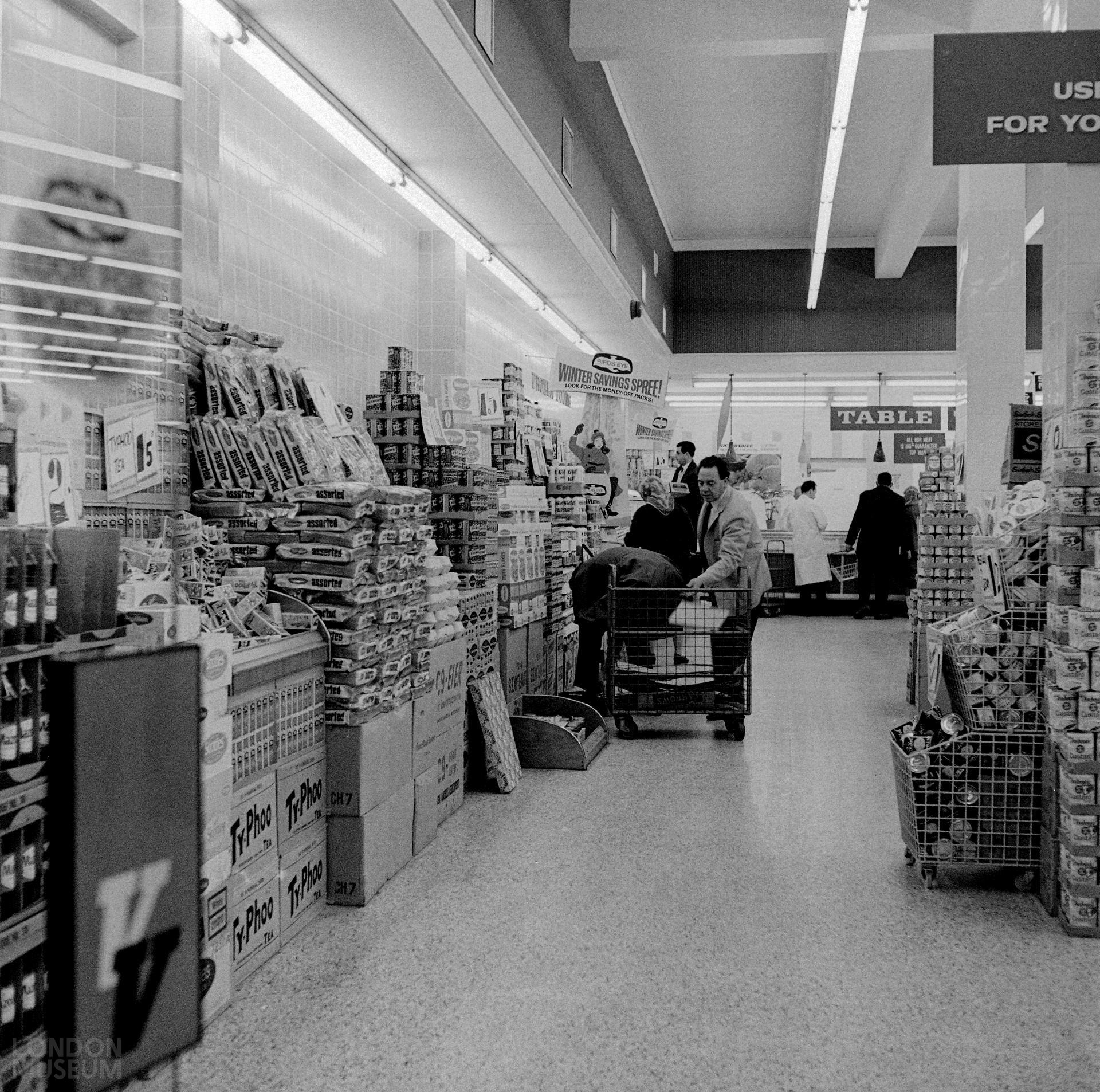 Tesco was founded in 1919 by Jack Cohen who combined the first two letters of his surname with those of a tea supplier, T E Stockwell. He began with a market stall in Hackney, the first store opened in Burnt Oak in 1929. The chain expanded dramatically during the 1950s and 60s and there were soon over 350 stores across the country. The idea of self service supermarkets was introduced in 1958 in Malden where for the first time customers could browse shelves and select goods themselves before taking them to a till instead of relying on assistants who fetched products from behind a counter. Products such as Typhoo tea and produce made by Birds Eye can be seen on the shelves of this store.