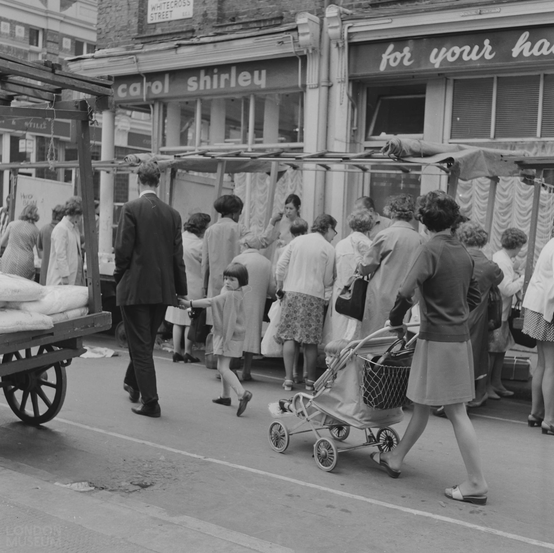 A family walking through Whitecross Street market in the City of London in July 1970. Whitecross Street market was established during the 17th century and was one of the largest Sunday markets in London. The market still flourishes today.