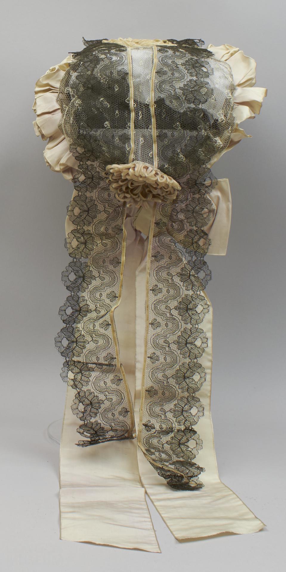 Black net cap lined with ruffles of mauve silk ribbon, tied into a bow beneath the chin, the crown decorated with cream velvet ribbon in the form of a flower.
