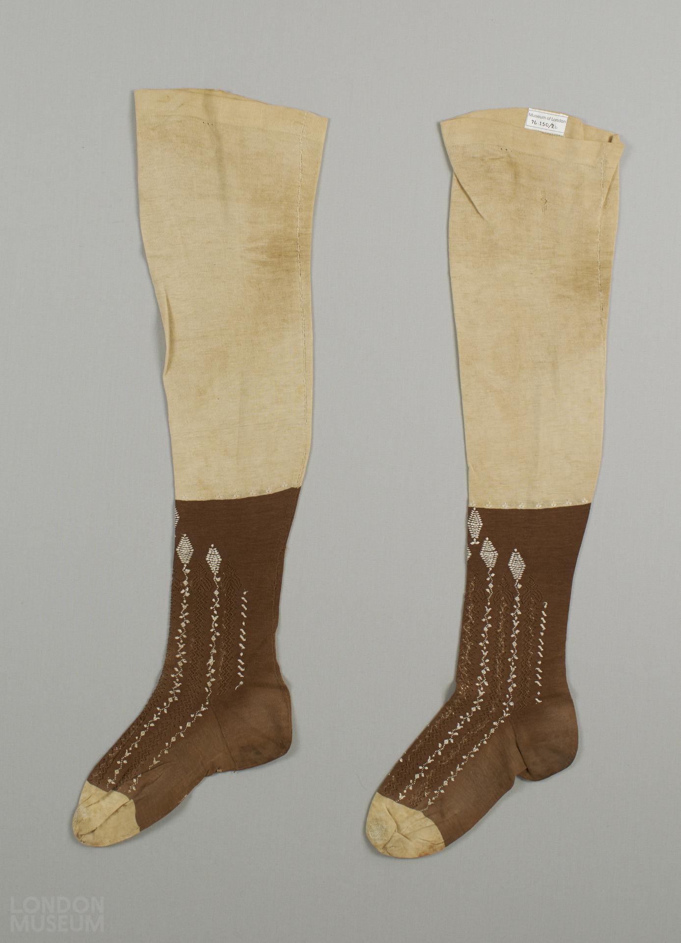 Pair of women's cotton lisle stockings. Portion from upper toes to mid calf dark brown with rows of open weave pattern alternating with rows of white embroidery; the toes and upper leg are in off-white (cream). White embroidery at the upper edge of the dark brown portion. Centre back seam. Machine stitched, hand embroidered.