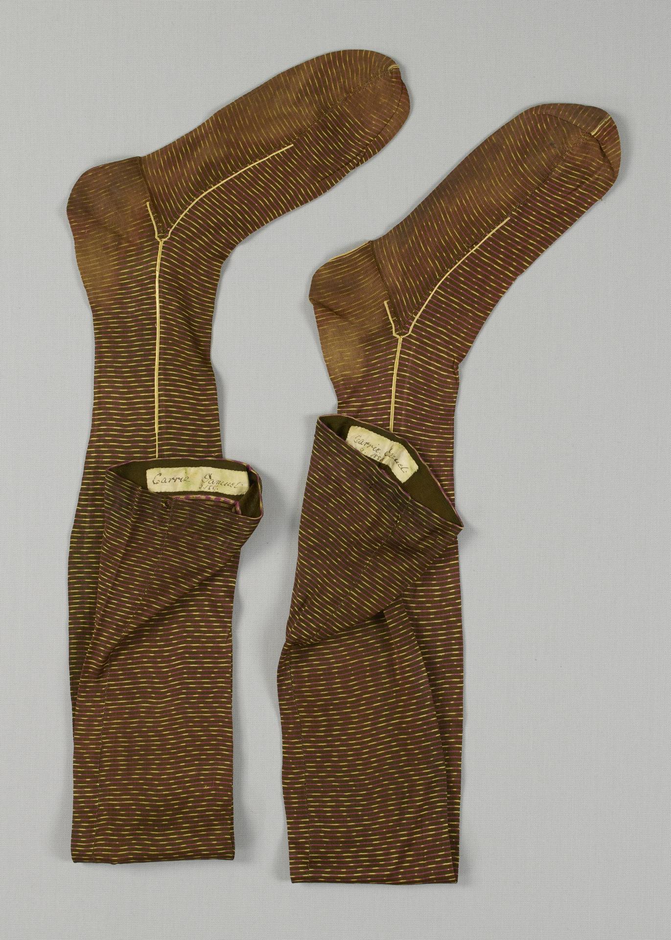 Pair of machine kniited brown silk stockings with all over design of broken red and yellow horizontal stripes. White textile label sewn to the top inside edge of each stocking, inscribed by hand in black ink 'Carrie Samuel 1887'.