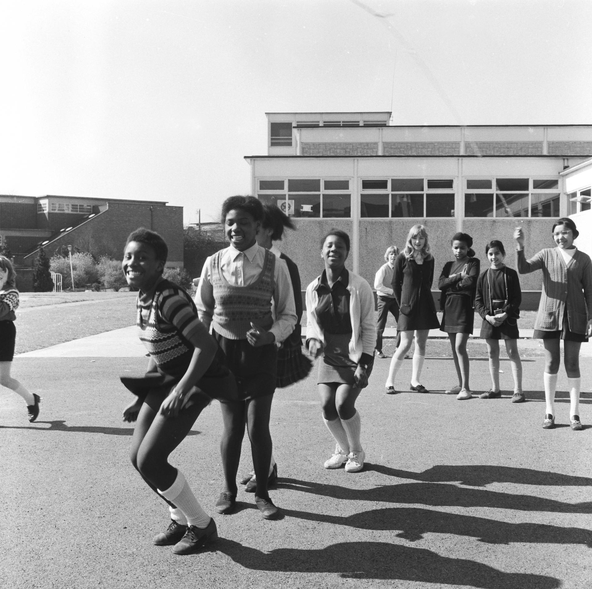 Girls skipping in the playground at the Alperton High School in Brent, March 1972.