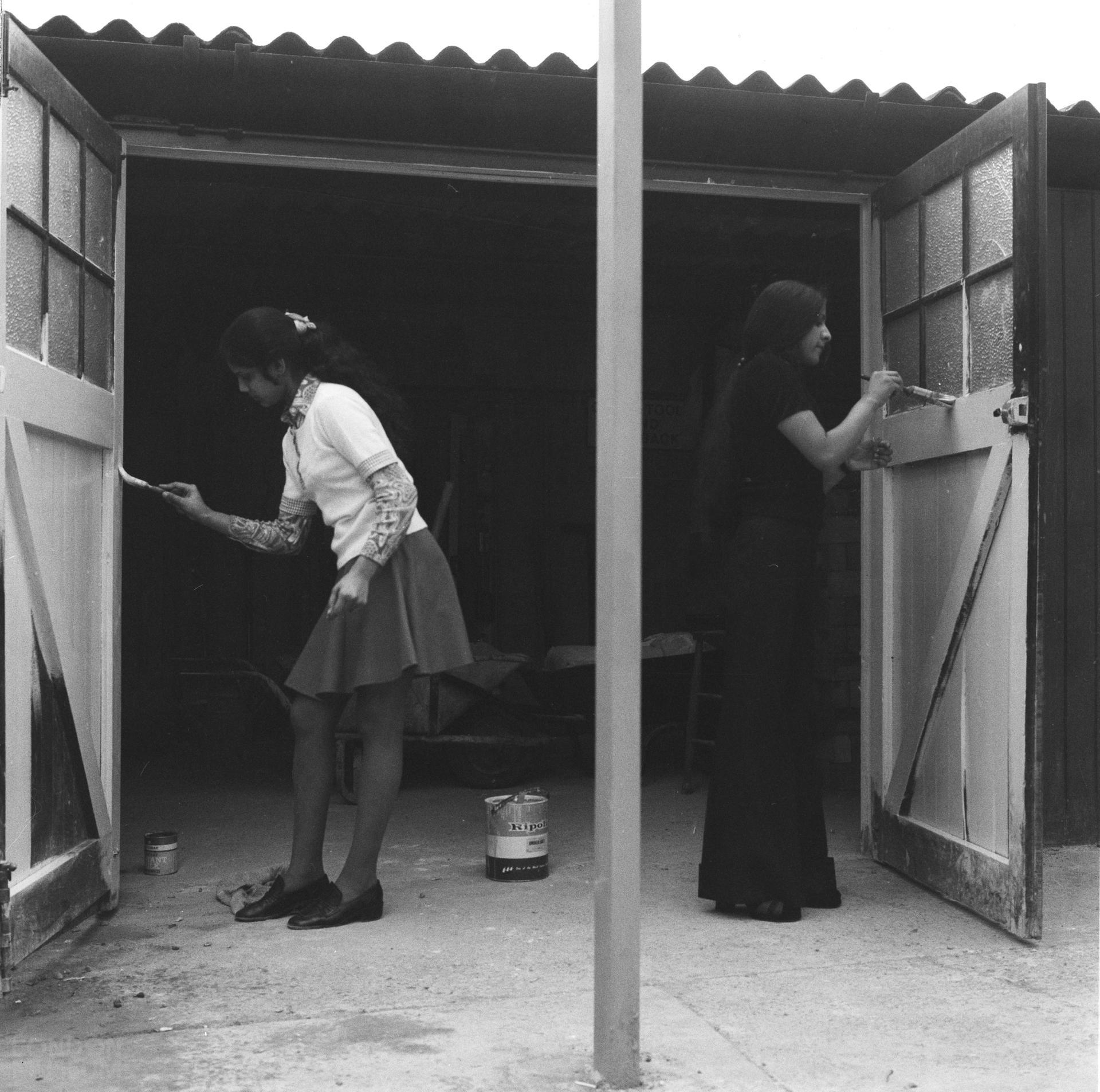 Two sixth form students painting garage doors as part of a course at Featherstone High school in Southall.