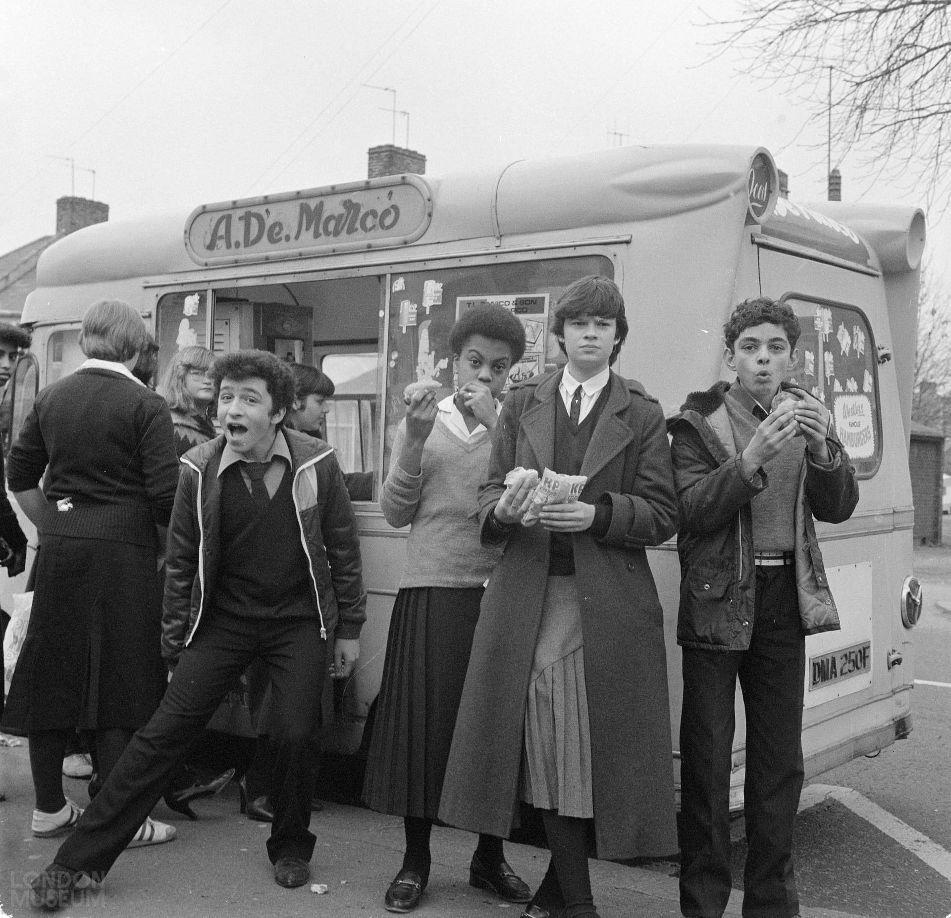 Teenage pupils from Arnos Grove Comprehensive school eating snacks from an Ice Cream van parked outside their school in 1979.