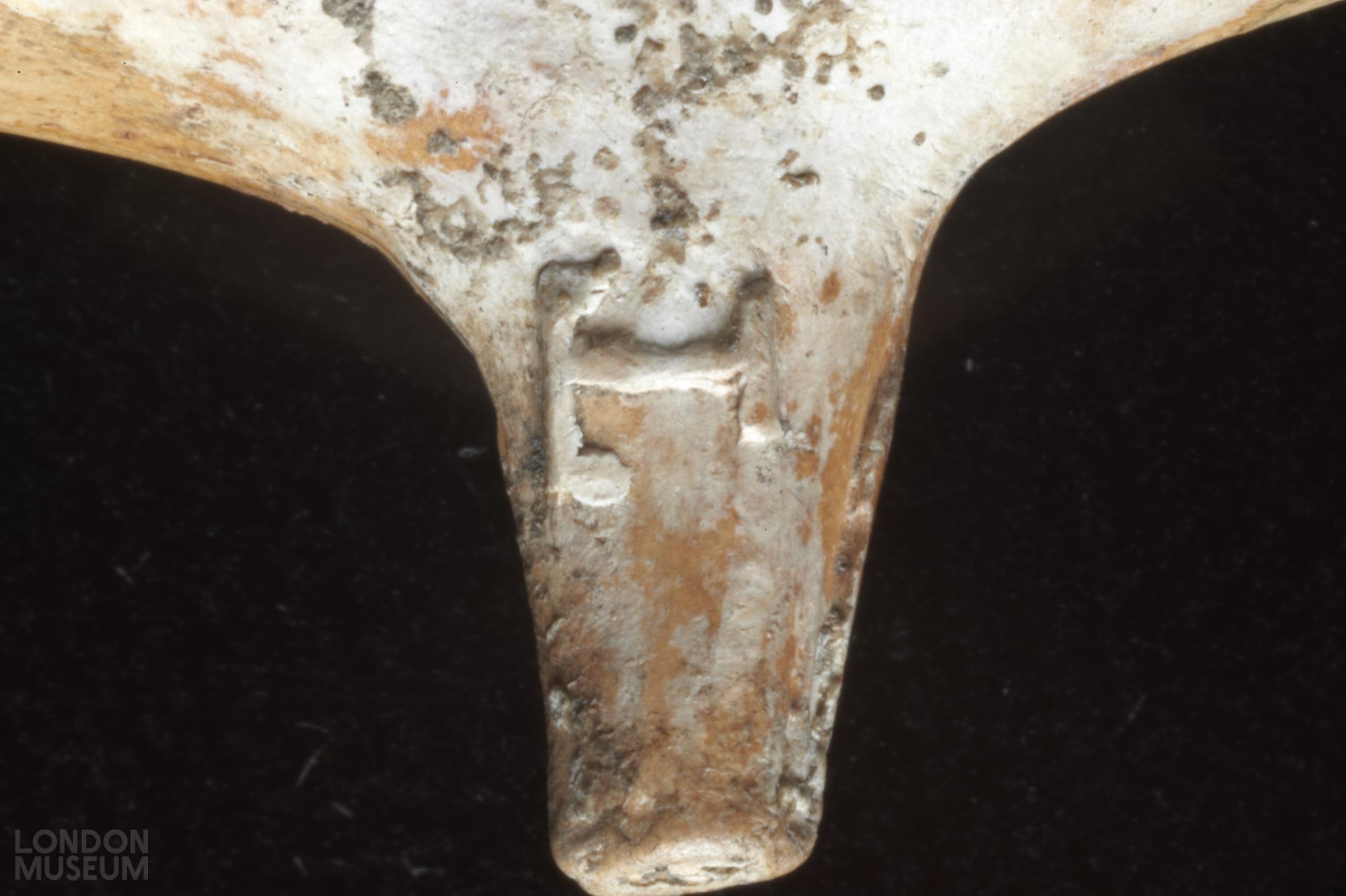 Bowl, incomplete. Moulded marks on sides of spur, in relief: T (left side facing smoker) T (right side). Stamped mark, incuse, on bowl, facing smoker: CURTIN 27 FISH ST …, with shield and crown. Atkinson and Oswald (1969) type 28