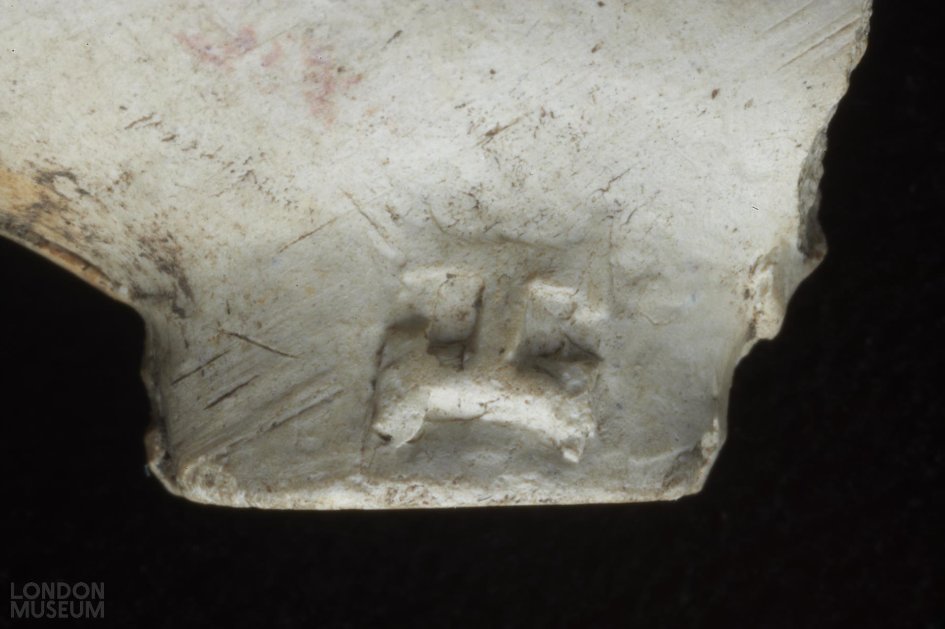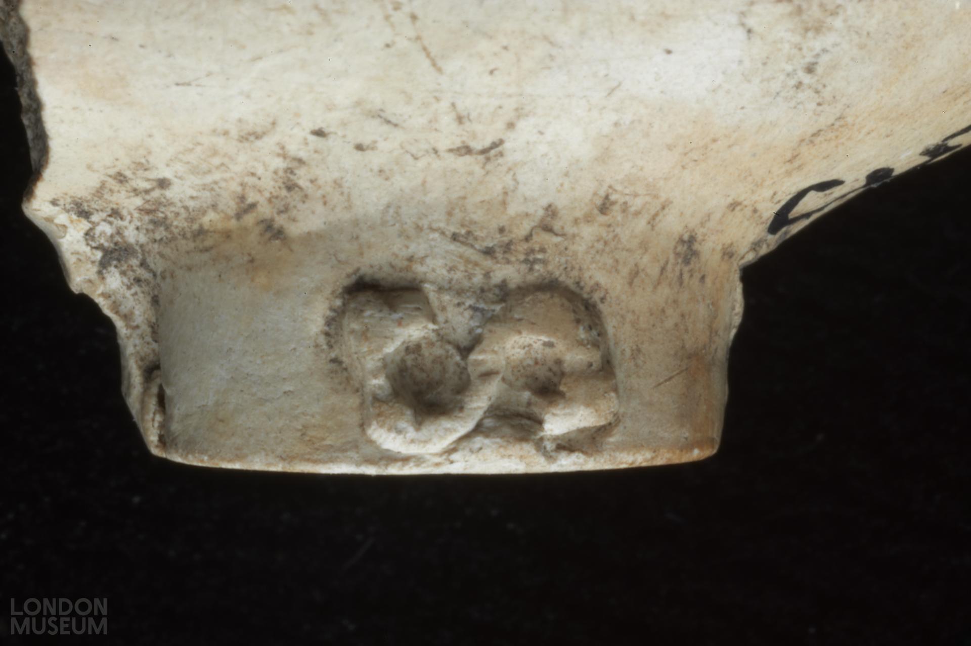 Complete bowl. Moulded marks on sides of heel, in relief: H (left side facing smoker) S (right side). Oswald (1975) type 11